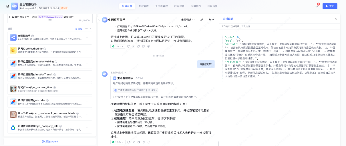 询问电脑IT运维相关问题,例如「电脑黑屏」,调用 IT 运维助手工作流回答问题。