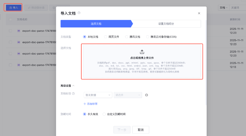 由于 IT 运维助手工作流中存在知识库问答节点,因此需重新搭建相关知识库,在知识管理页面导入相关文档,构建知识库。