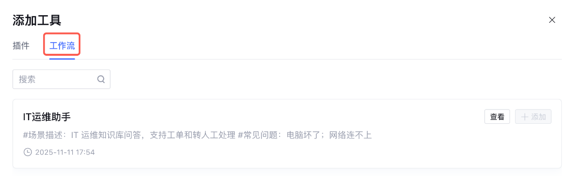 添加工作流作为工具是指在 Multi-Agent 模式中,Agent能够添加应用内已配置的工作流作为工具并进行调用。Agent 直接复用稳定可控的业务流程,拓展能力边界,使应用配置更加灵活可控。