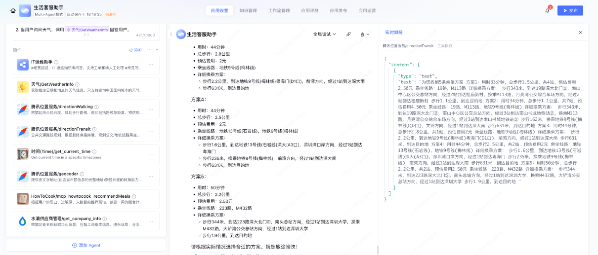 Multi-Agent 模式区别于标准模式,应用的执行不是按照固定标准流程推进的,而是依赖大模型进行任务的规划,根据用户的输入,由模型来进行任务的拆解和主动工具调用,大模型需要理解插件中工具的名称和描述信息,选择合适的插件。