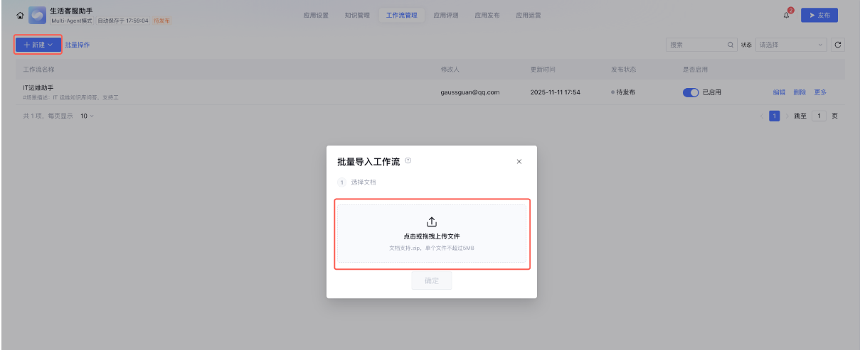 进入工作流管理页面,导入已经搭建好的IT运维助手工作流压缩包。