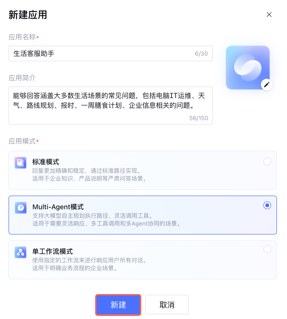 在应用开发页面点击新建应用,输入应用名称和应用简介,选择 Multi-Agent模式,单击新建进入应用设置页面。