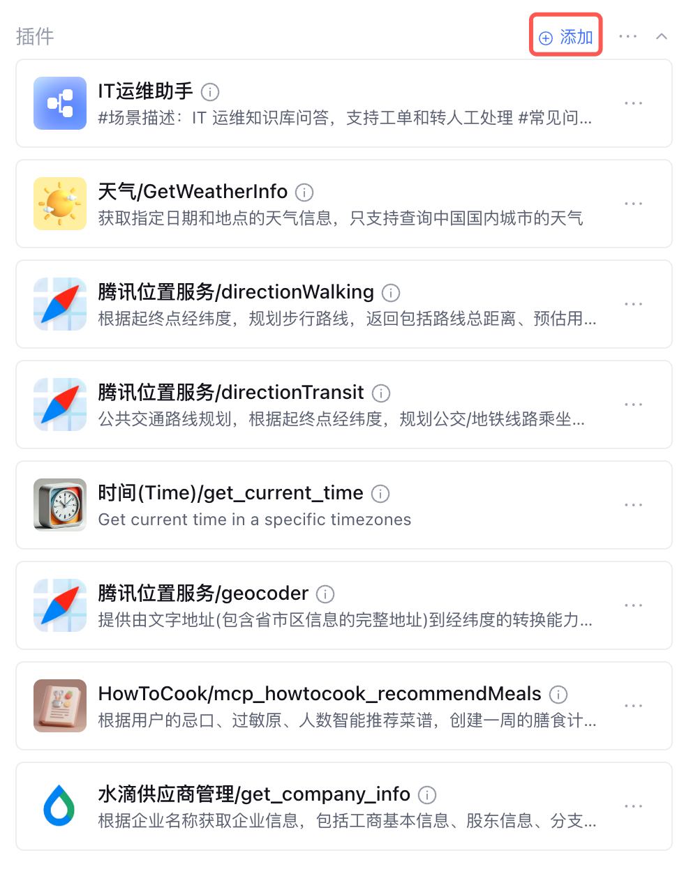 在工具设置单击添加,分别在添加工具页面的插件及工作流部分选择需要的工具,输入 Agent 提示词,完成生活客服助手 Agent 的配置。