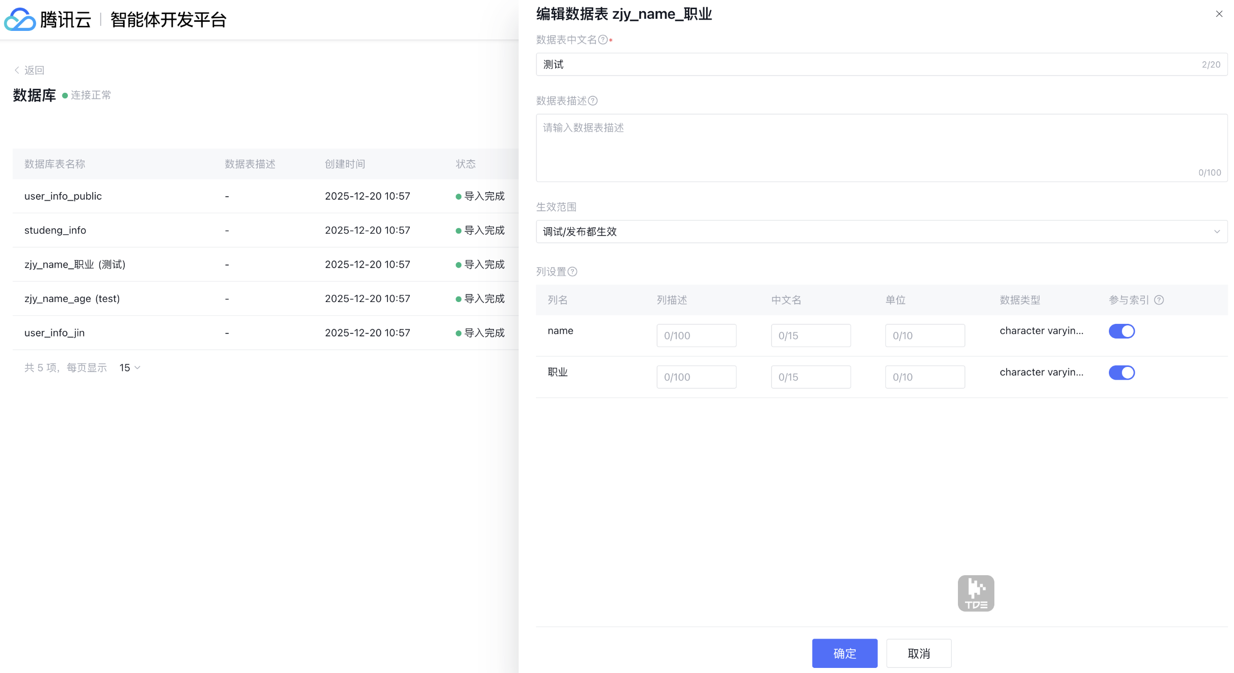 数据库是用于存储和管理结构化数据格式文件的系统。将数据库连接至腾讯云智能体开发平台后,可以赋予智能体基于结构化数据进行问答的能力,支持单表查询、多表查询等。