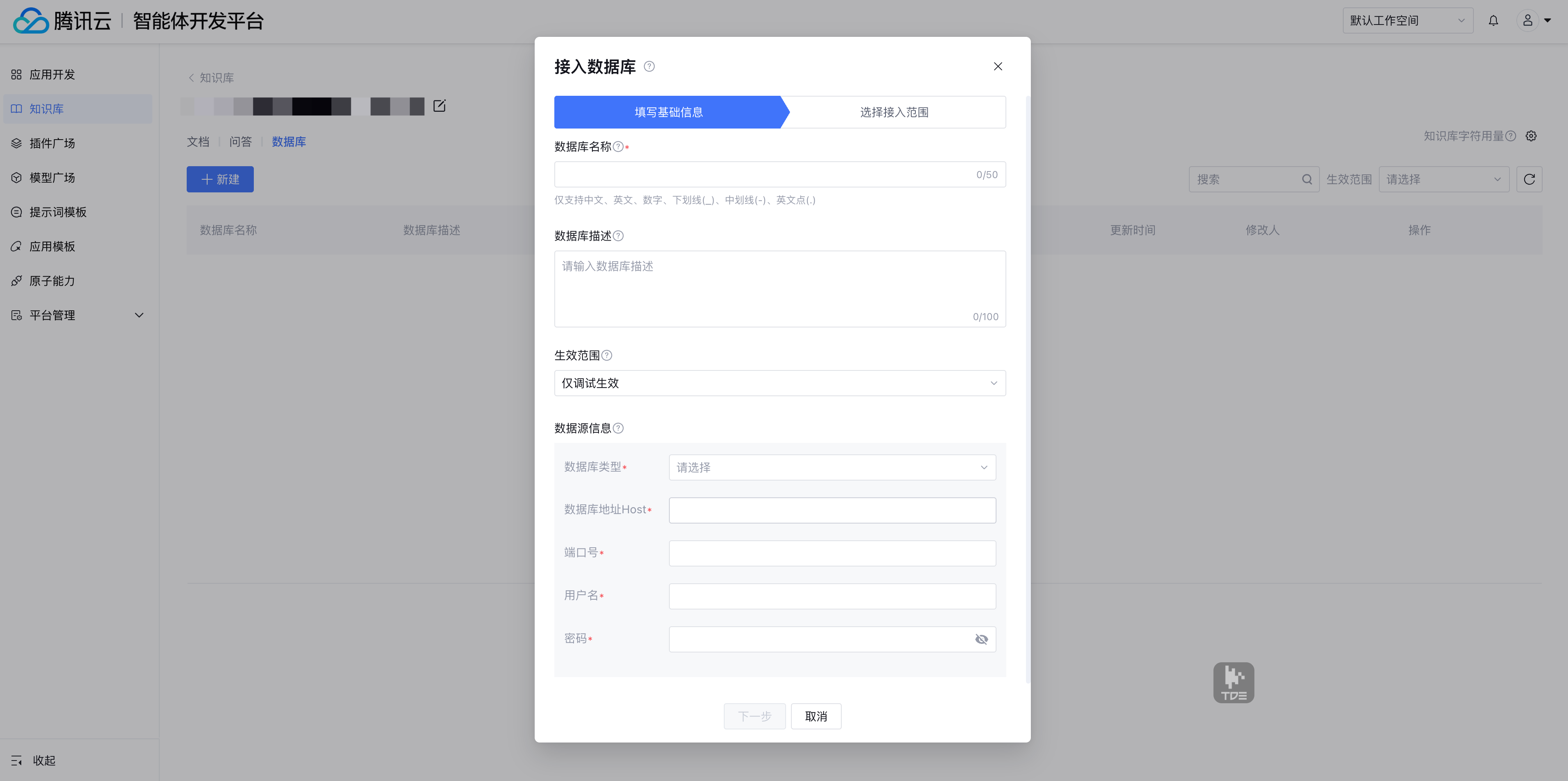 3. 基础信息填写完成后,单击下一步,可选择接入范围,即:选择要接入的数据库、数据表。之后单击确定接入即可接入数据库。