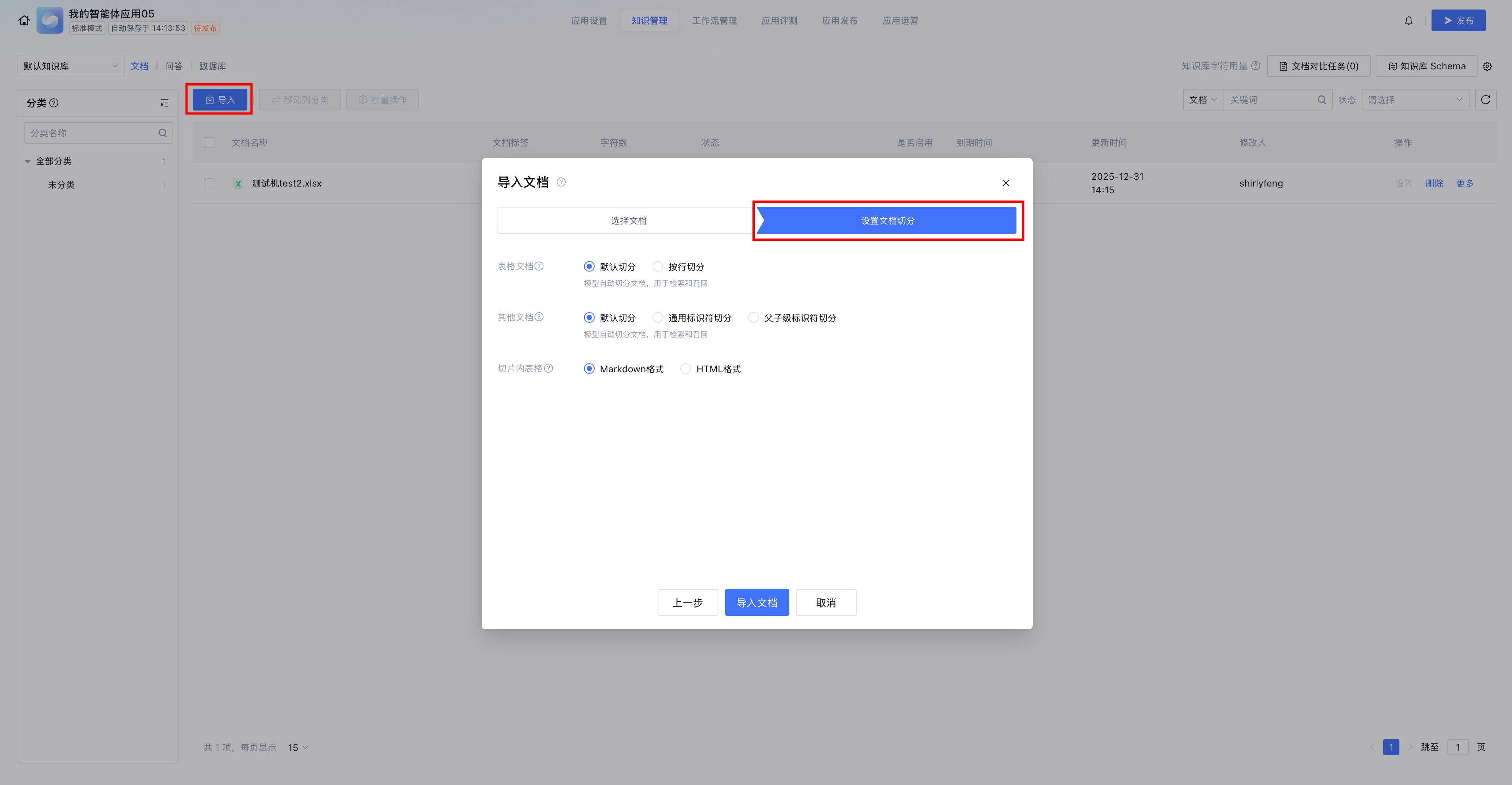 入口1:在知识库中第一步上传文档,第二步设置文档切片。按照文档类型对同一批上传的文档生效。