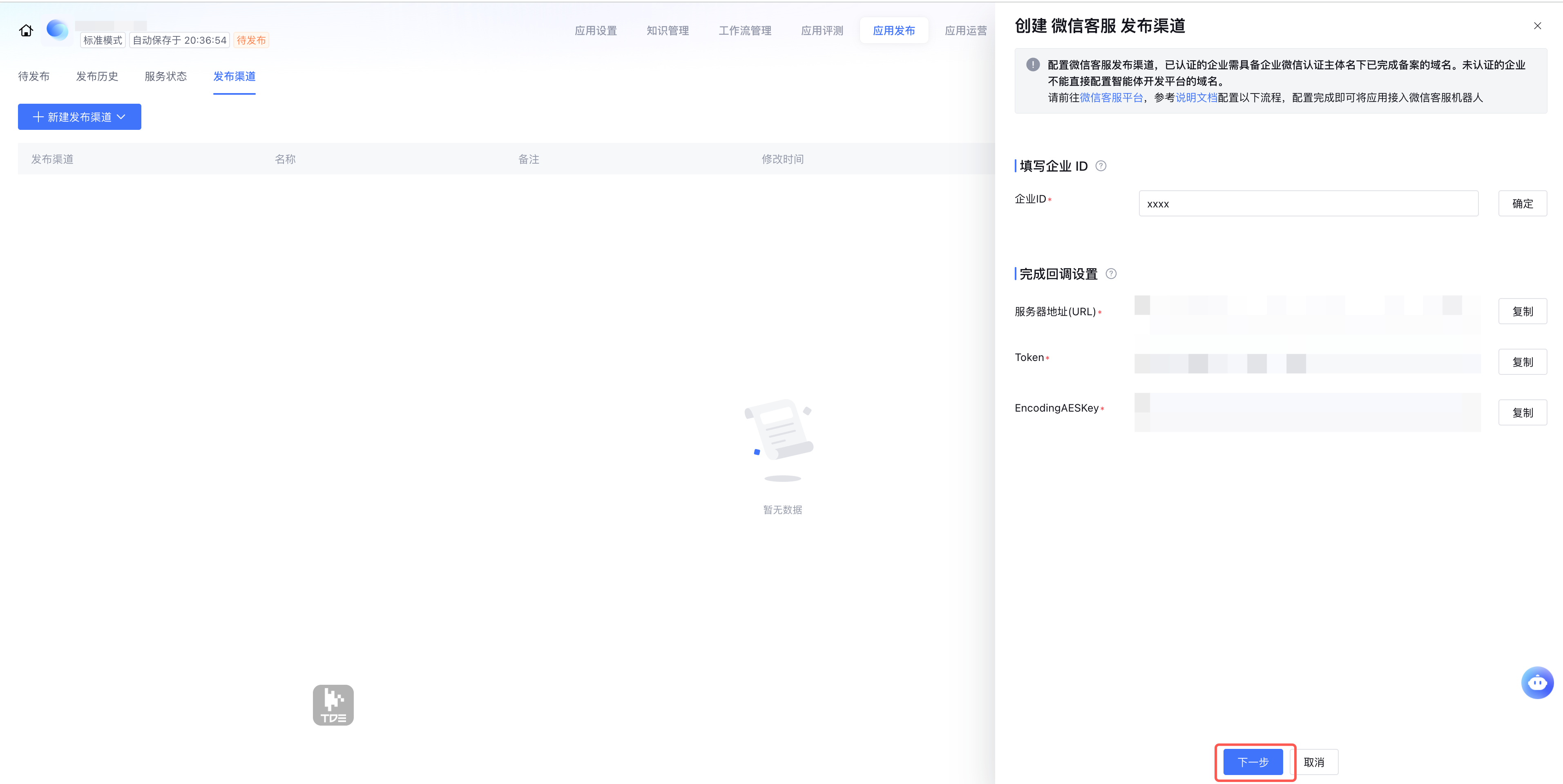 6. 在智能开发平台中,点击下一步,输入企业 secret 和客服账号。