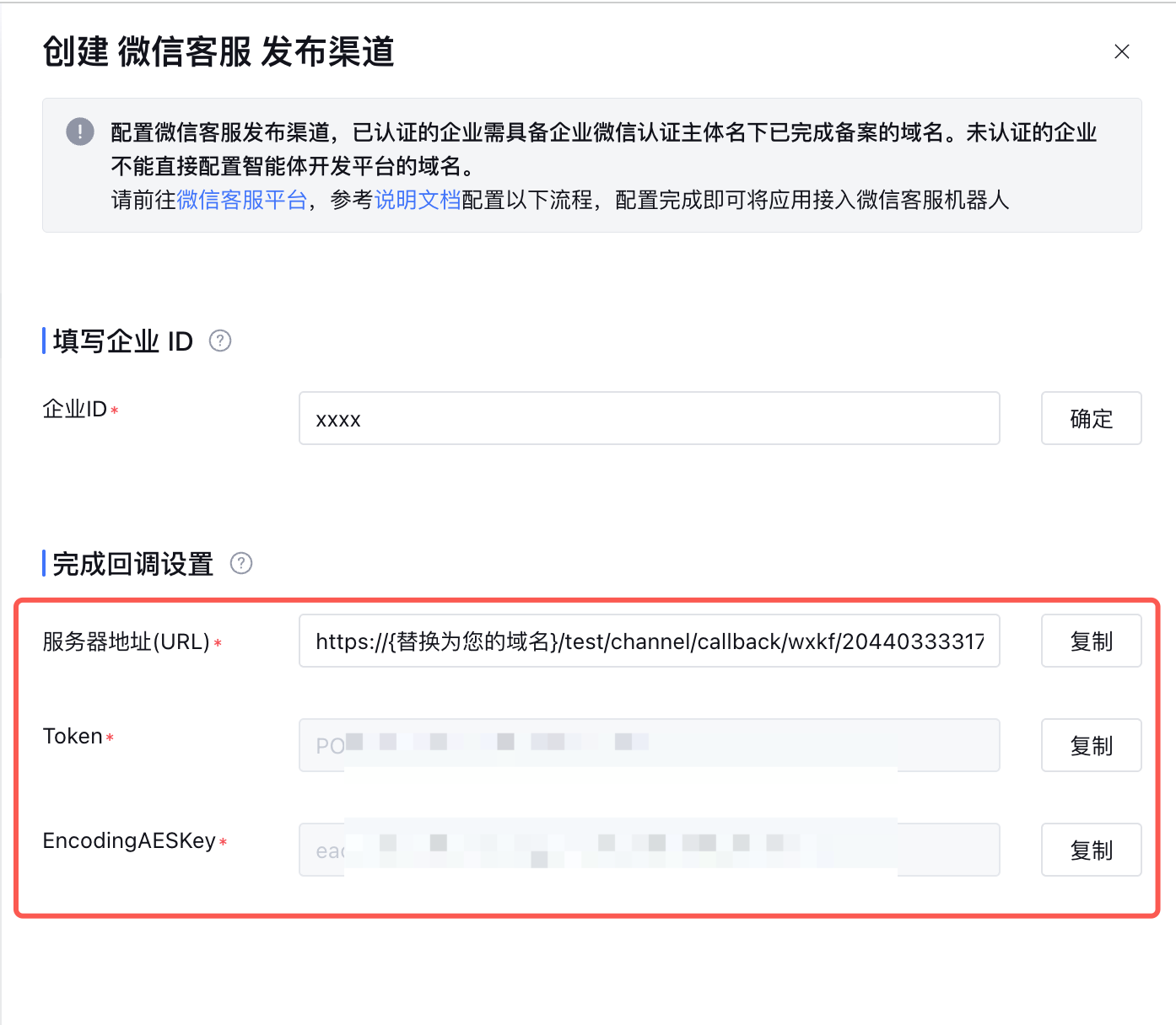 4. 将智能体开发平台中微信客服渠道中回调设置的服务器地址(URL)、Token、EncodingAESKey 信息填入微信客服后台。
