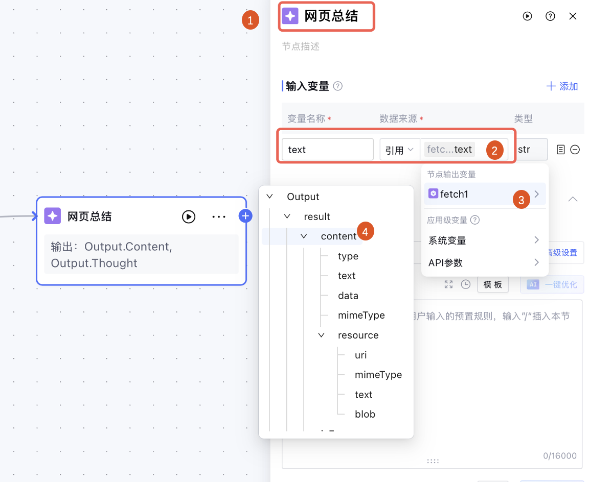 text ,设置数据来源为引用 fetch1 节点的输出变量 Output.result.content.text。