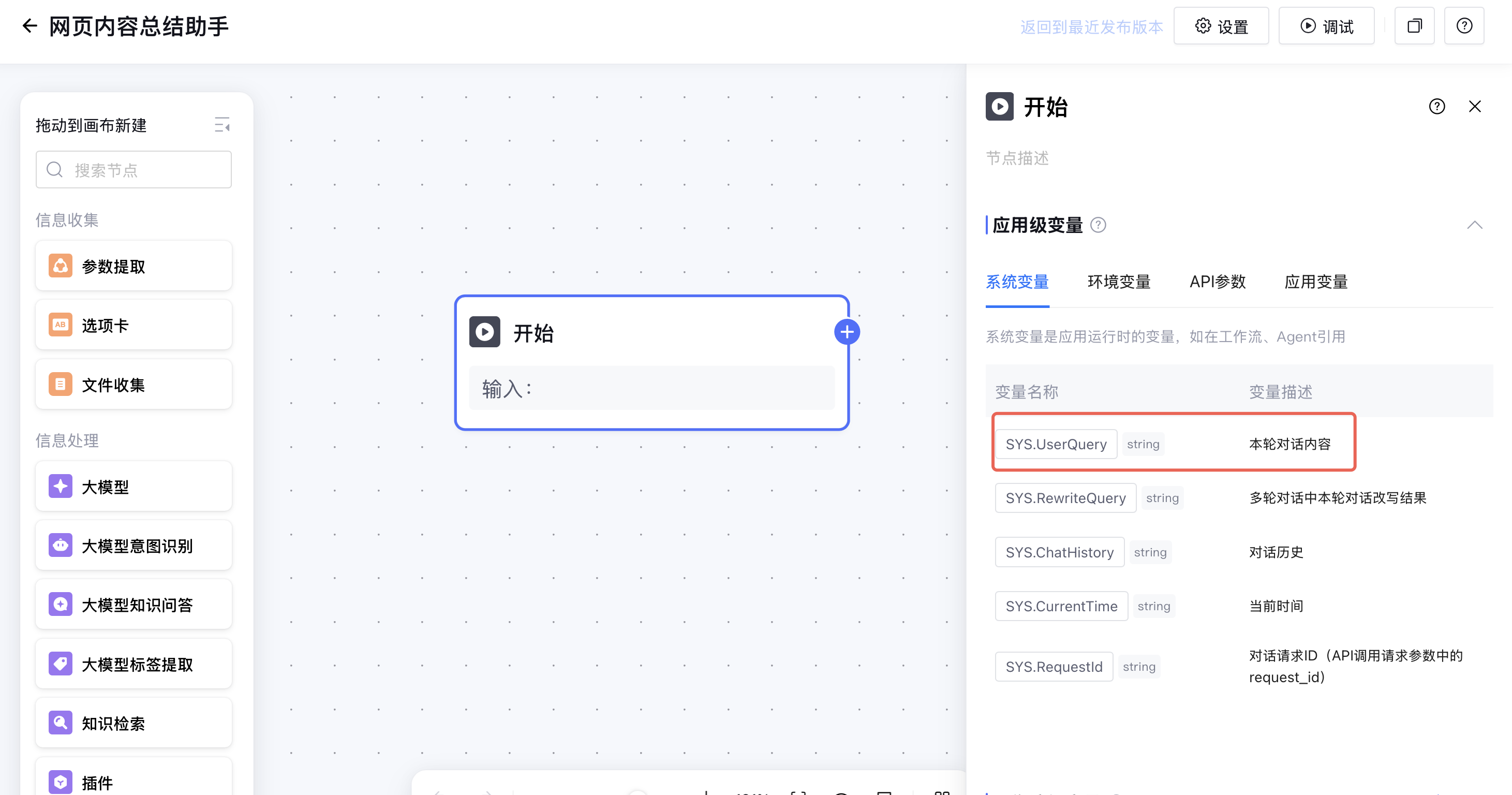 画布中自带开始节点和结束节点。开始节点用于设定启动工作流需要的信息。本场景中,用户需要提供待解析的网页链接。链接默认通过开始节点的