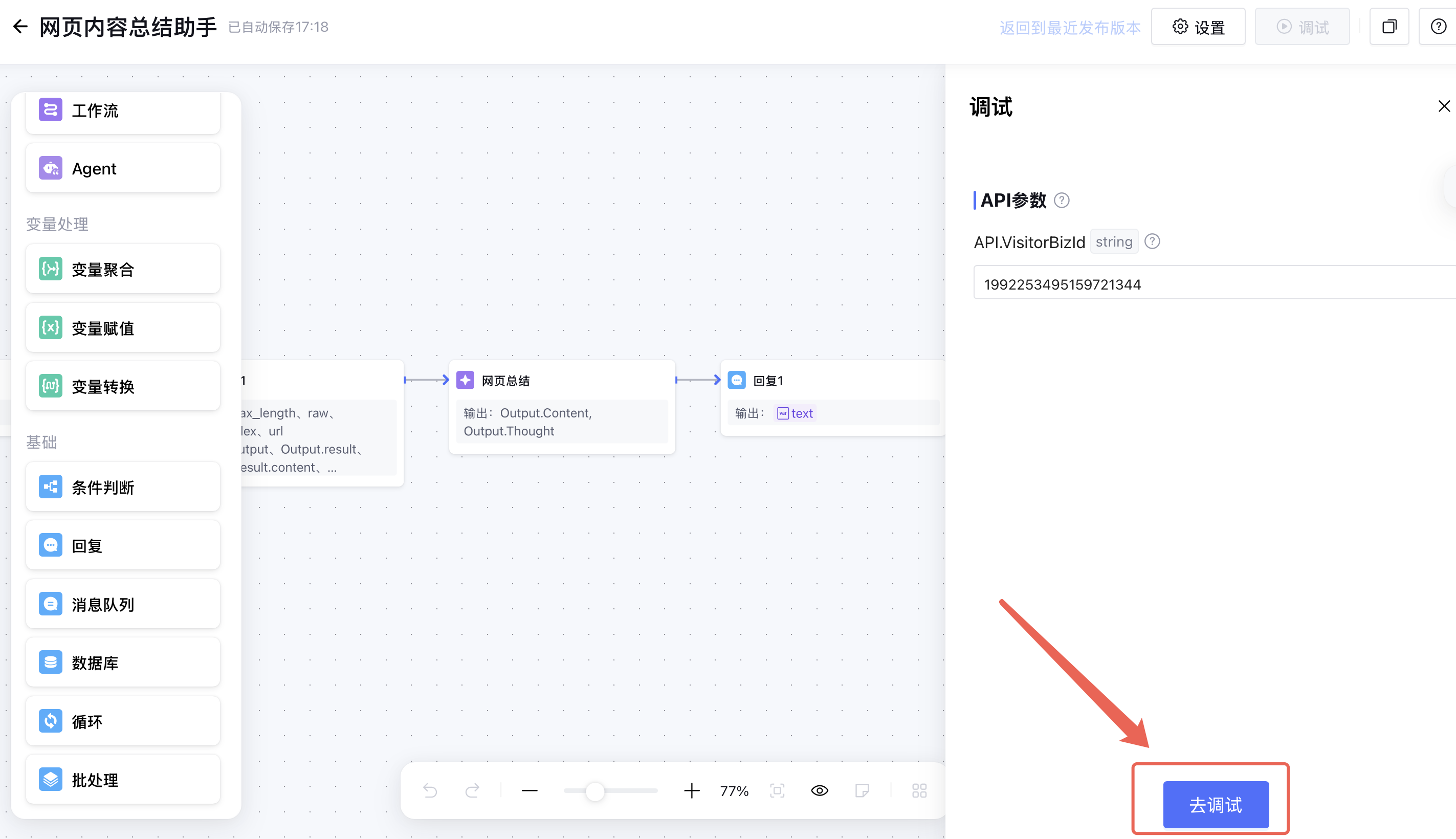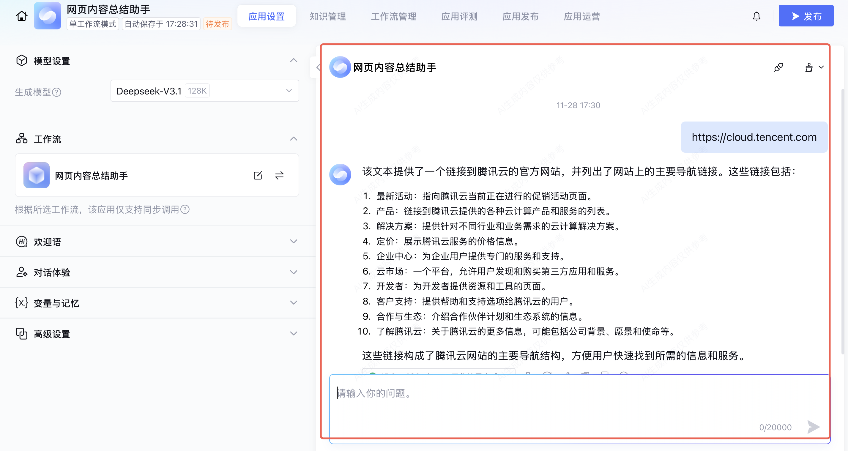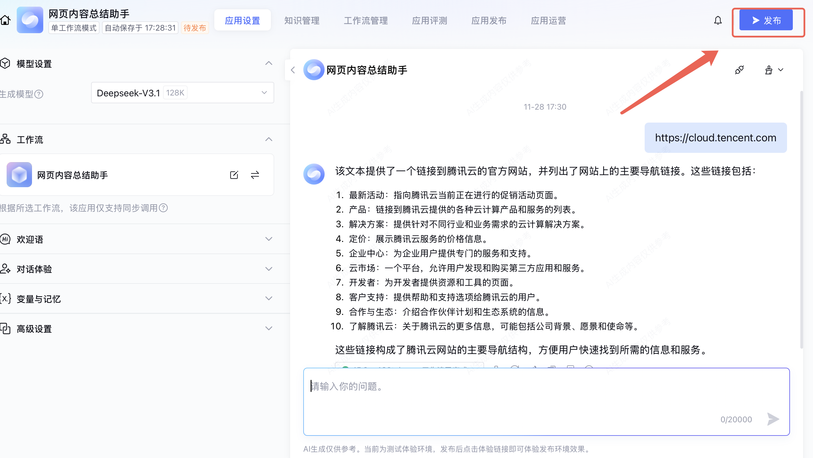 设置好应用后,您可以在右侧调试区域测试应用是否符合预期。