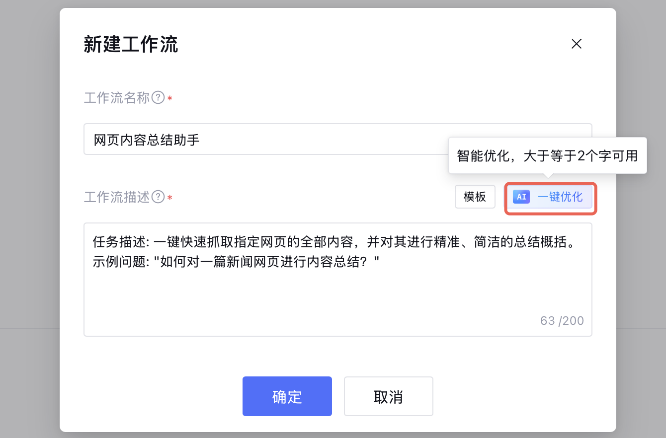 您也可以使用 AI 一键优化对您输入的工作流描述进行优化,让大语言模型将您输入的内容优化为结构化内容,以便大模型更易理解何时触发工作流。