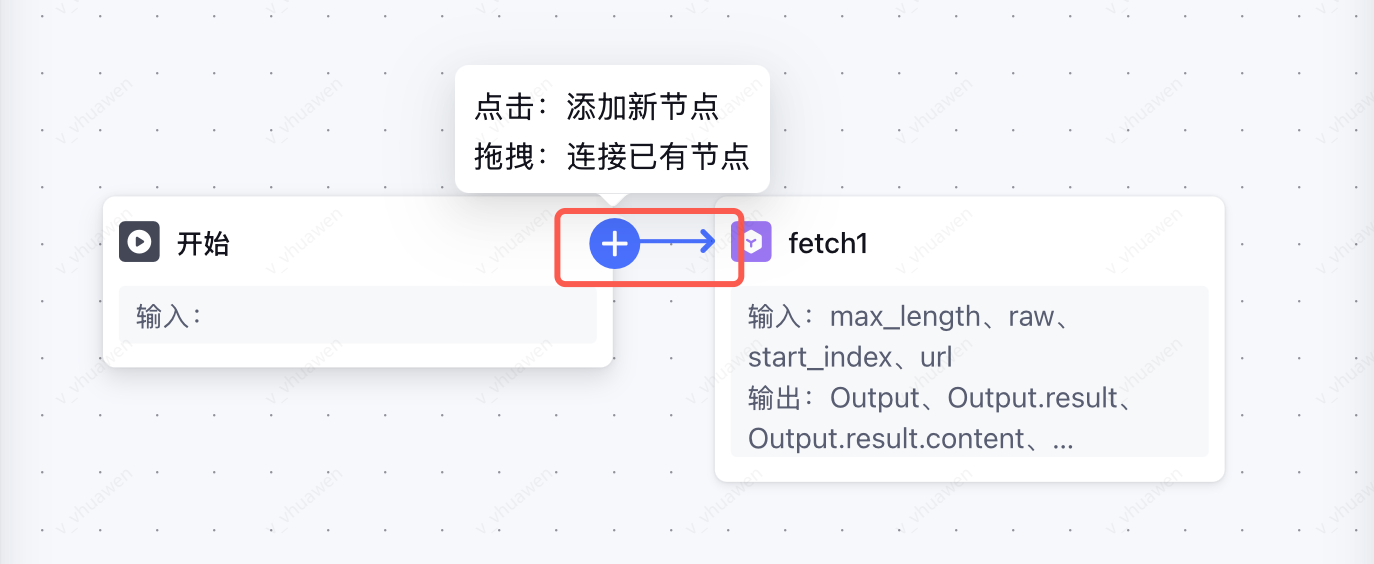 若使用拖拽方式添加节点,需要手动将节点进行连接。长按开始节点后“+”号,并将箭头拖拽至插件节点左侧。