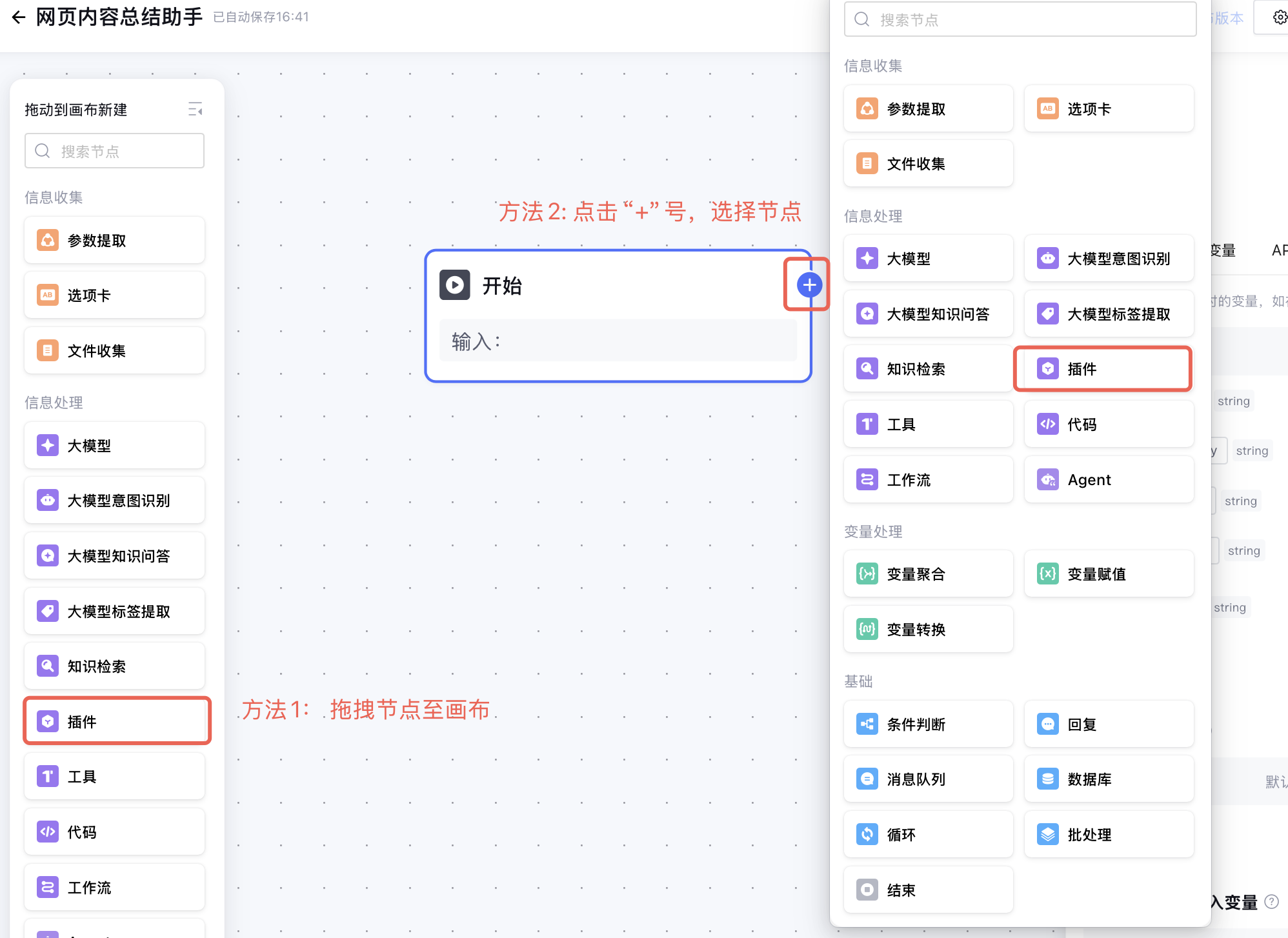 拖拽左侧边栏中的插件节点,或者点击开始节点后的“+”号添加插件节点。