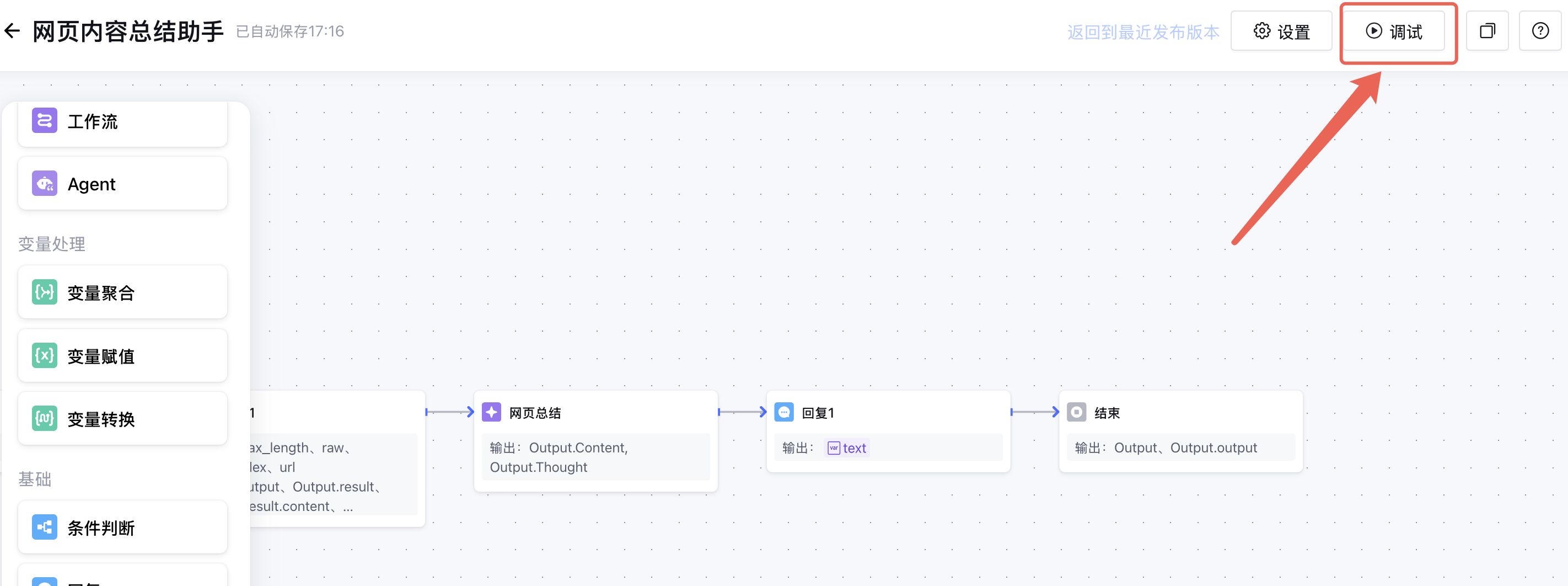至此您已实现基于“单工作流模式”创建“网页内容总结助手”。如需了解标准模式和 Multi-Agent 模式应用可参看: