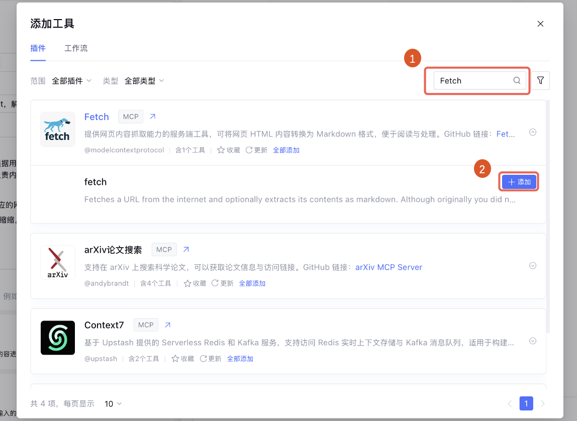 fetch 插件。工具栏支持为 Agent 配置多样化功能插件,如知识库问答、网页爬取、地图定位等。模型将按照提示词设定的任务目标,匹配对应插件自动执行调用流程,来完成复杂任务。