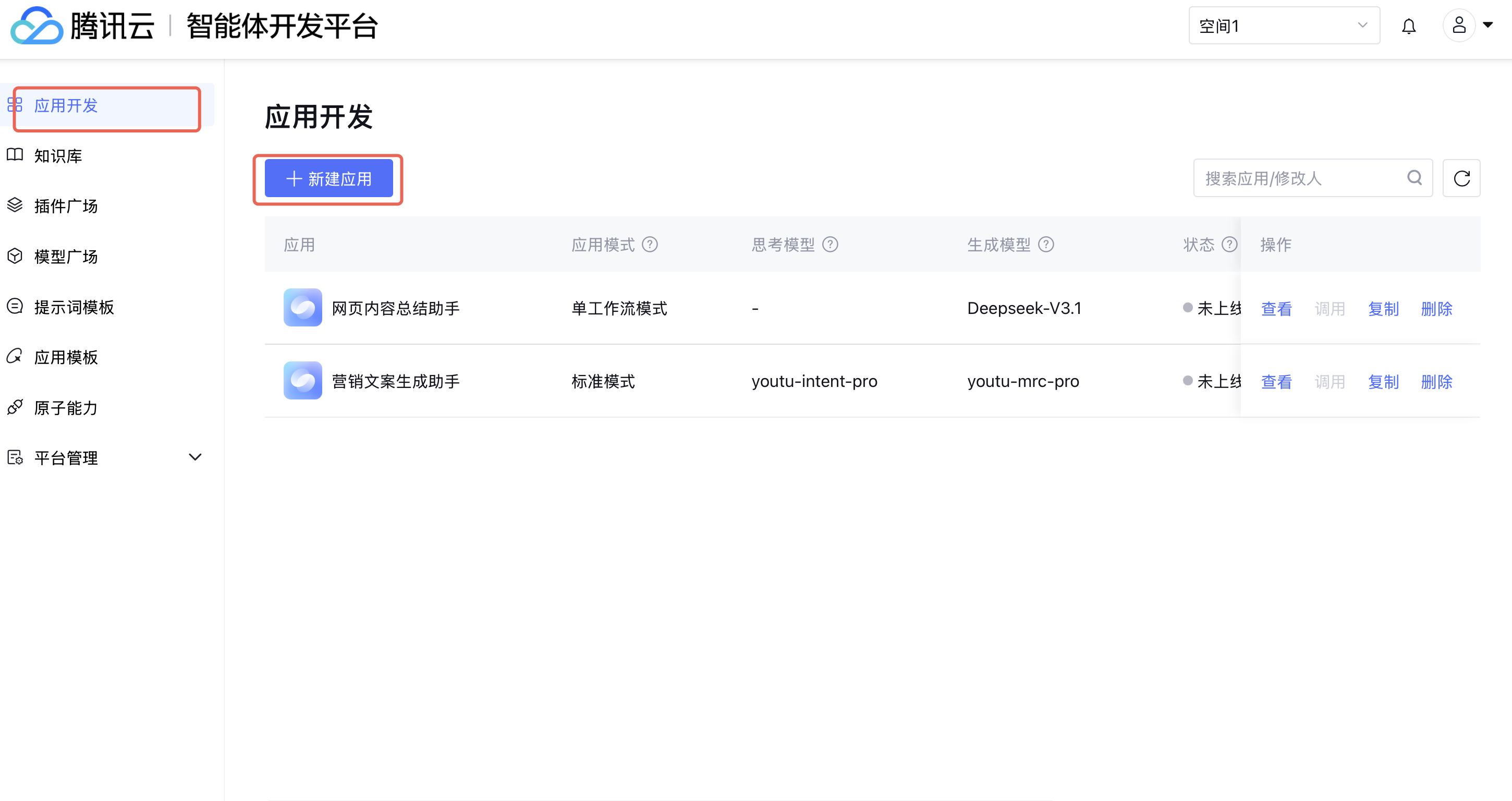 2.1 在左侧菜单栏,单击应用开发,然后单击新建应用。