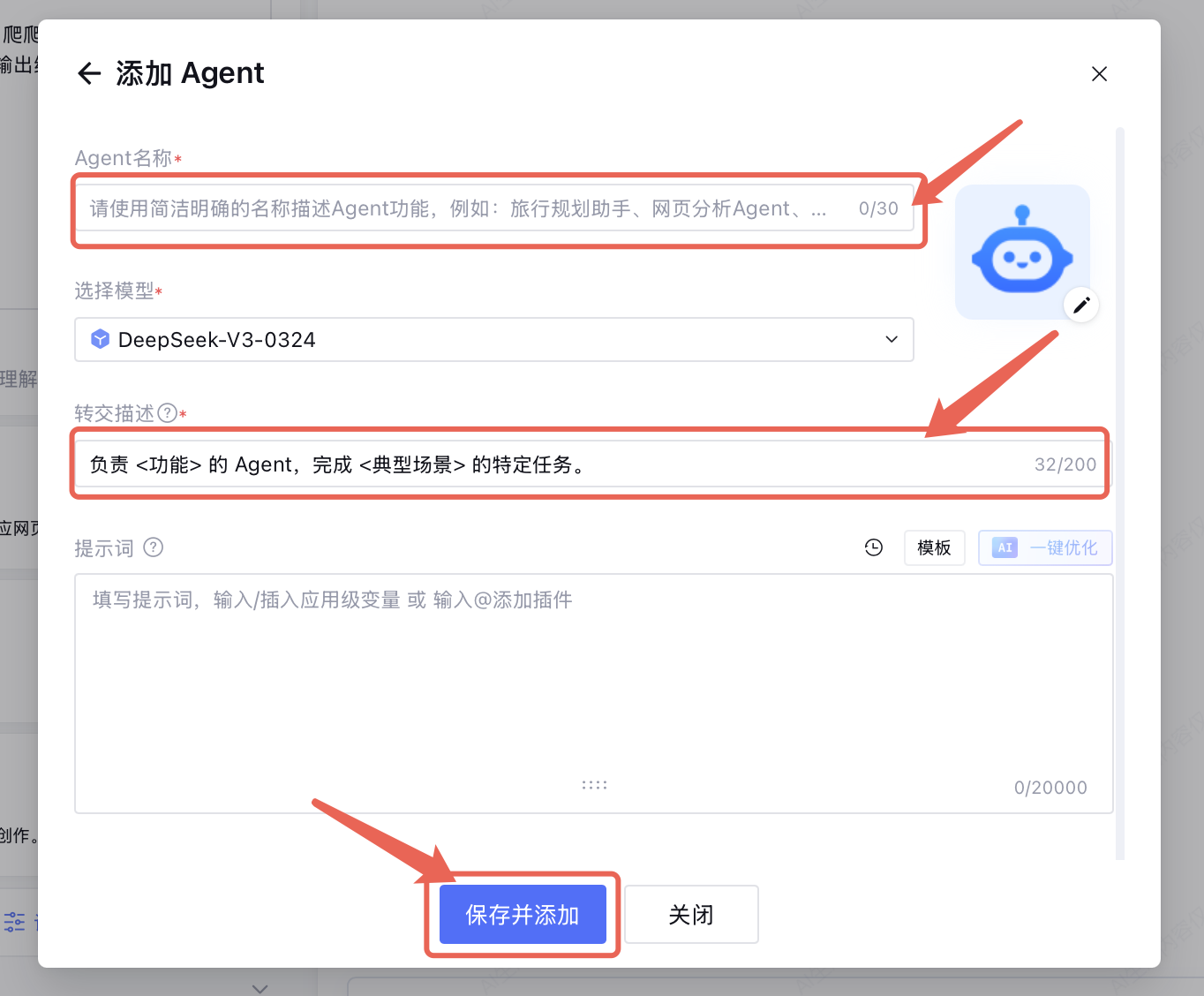 填写 Agent 名称、转交描述,其他模块可选填。创建后各内容也可进行修改。