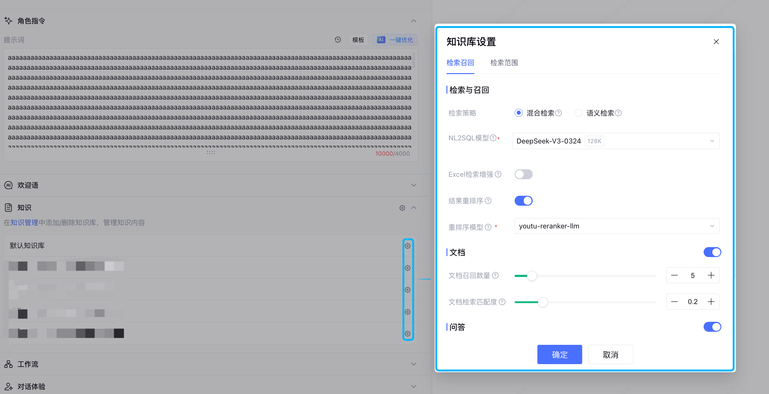 您可以根据实际业务需求,在应用的知识管理内,单击右上角齿轮按钮,进入知识库设置页,调整默认知识库内对于不同类型知识的检索与召回机制、检索范围以及所使用的模型配置。
