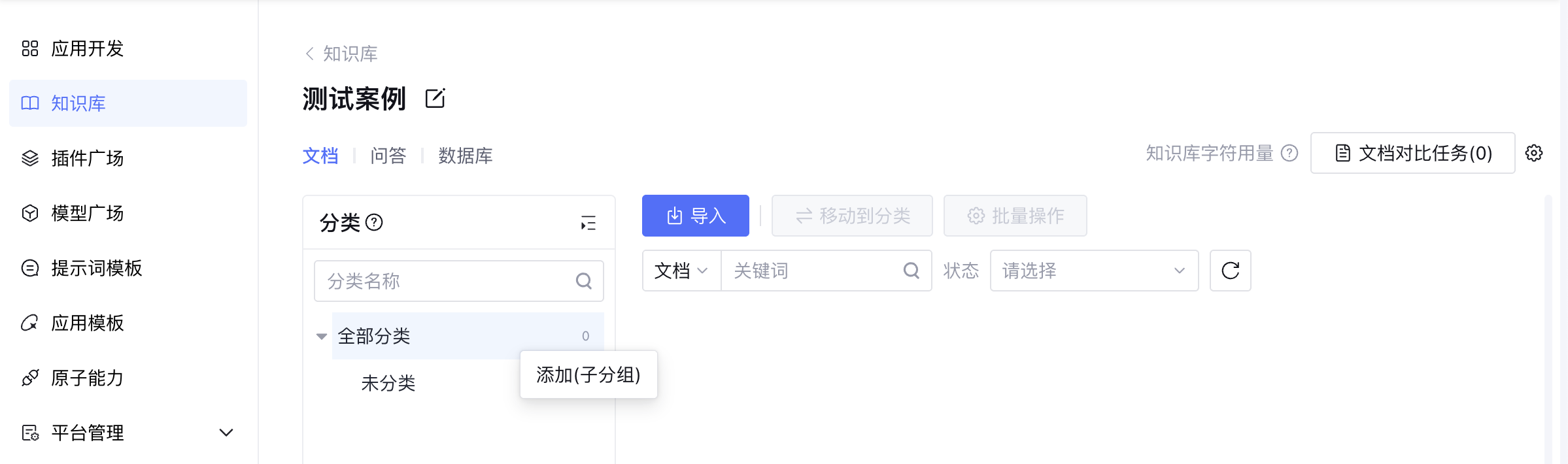 在知识库页面,您可以统一管理已导入的文档、问答或数据库。例如,调整文档的分类、标签和到期时间,便于知识的结构化组织与生命周期管理;配置知识库所使用的问答生成模型和 Schema 生成模型,以提升知识问答的准确性和检索效果;同时还能实时查看知识库字符用量,帮助您掌握资源使用情况。通过知识库设置,您不仅可以灵活维护文档,还能优化知识库的整体运行效果和业务适配度。