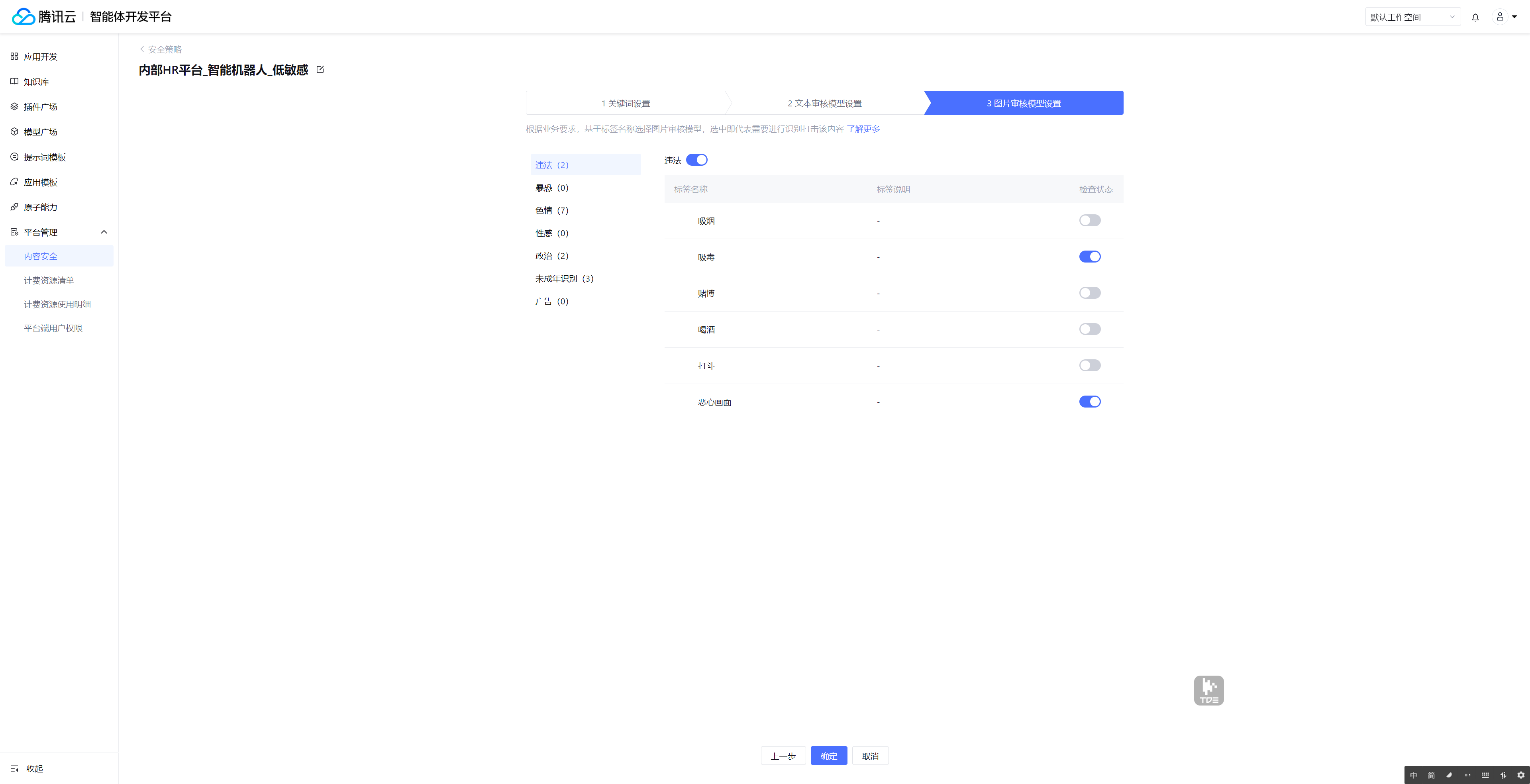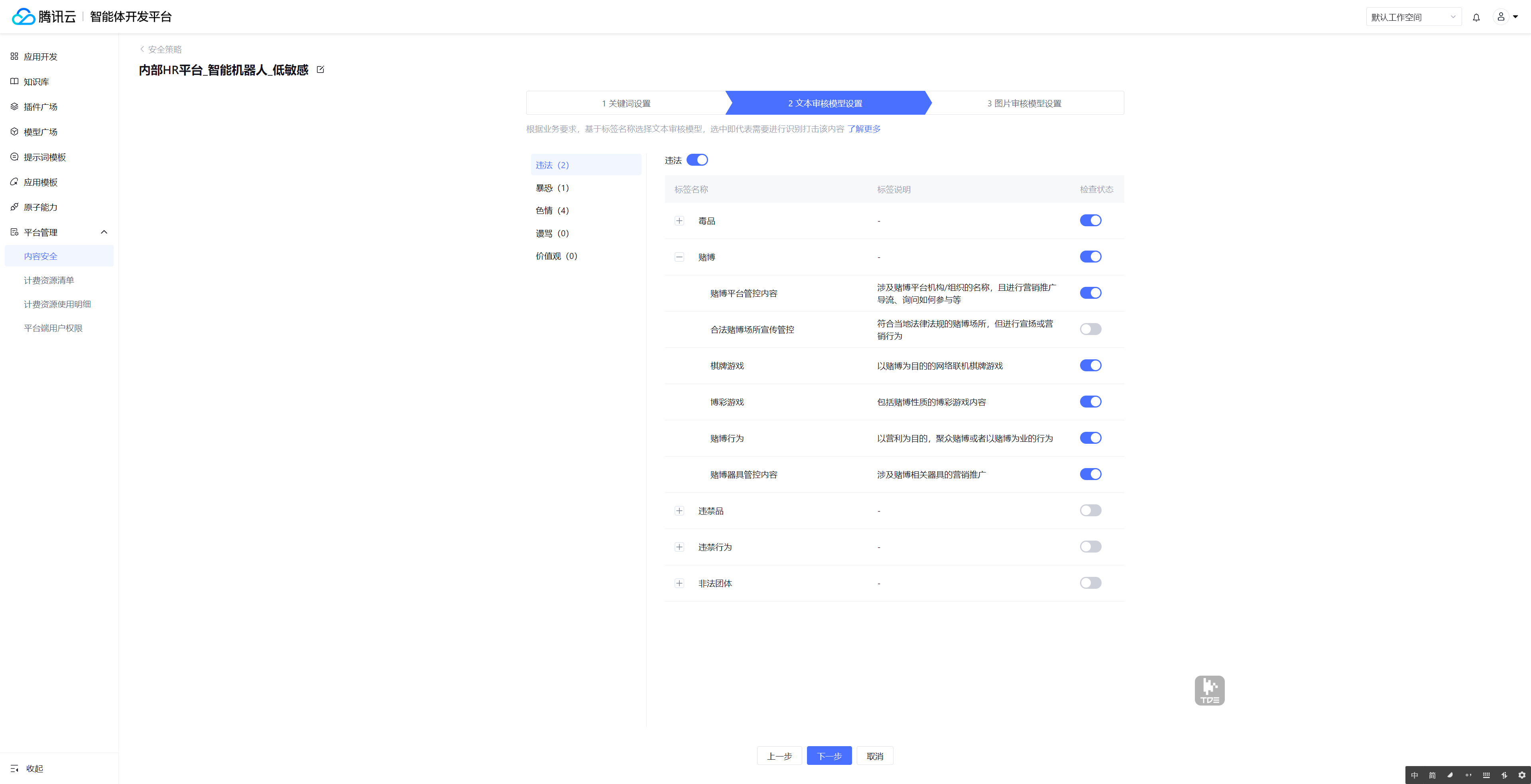 4. 自定义策略编辑共三步,分别为“关键词设置”、“文本审核模型设置”和“图片审核模型设置”。