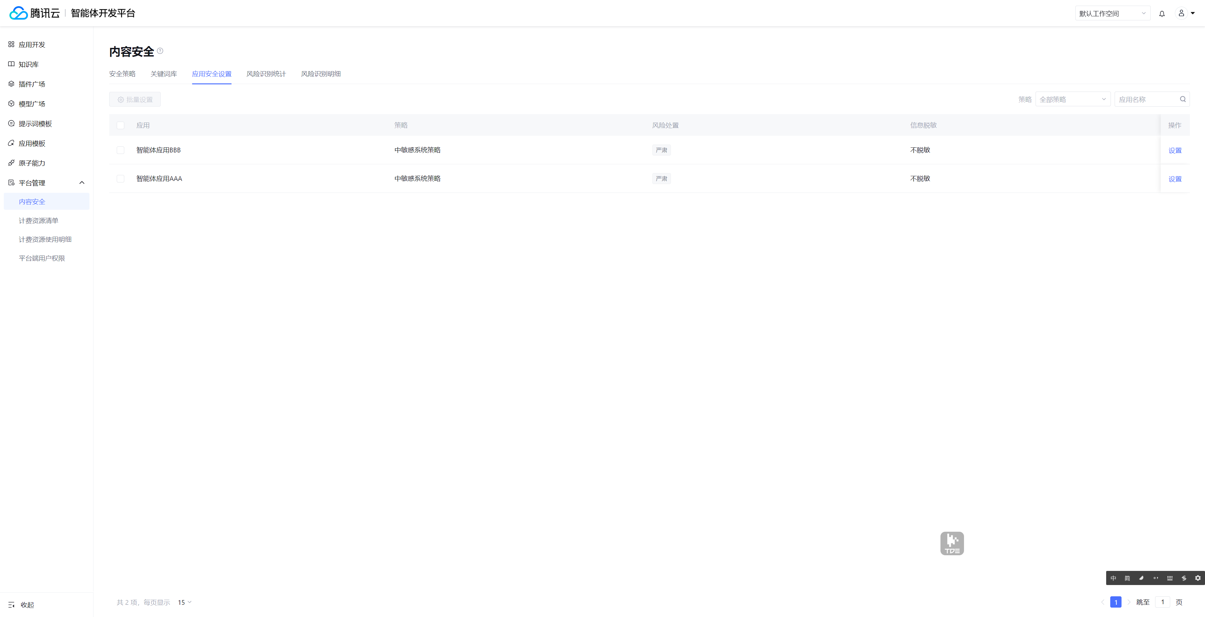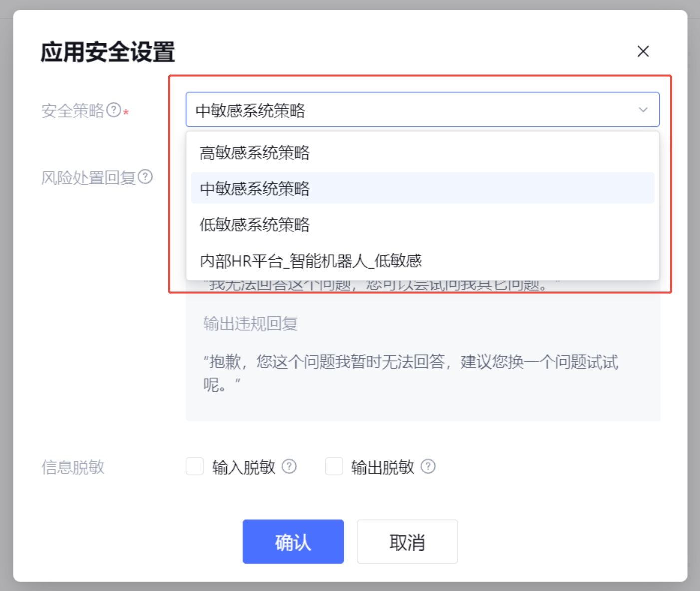 该页面以应用为维度,来设置各应用使用的安全策略、命中风险内容后的处置文案、以及是否启用隐私信息脱敏。