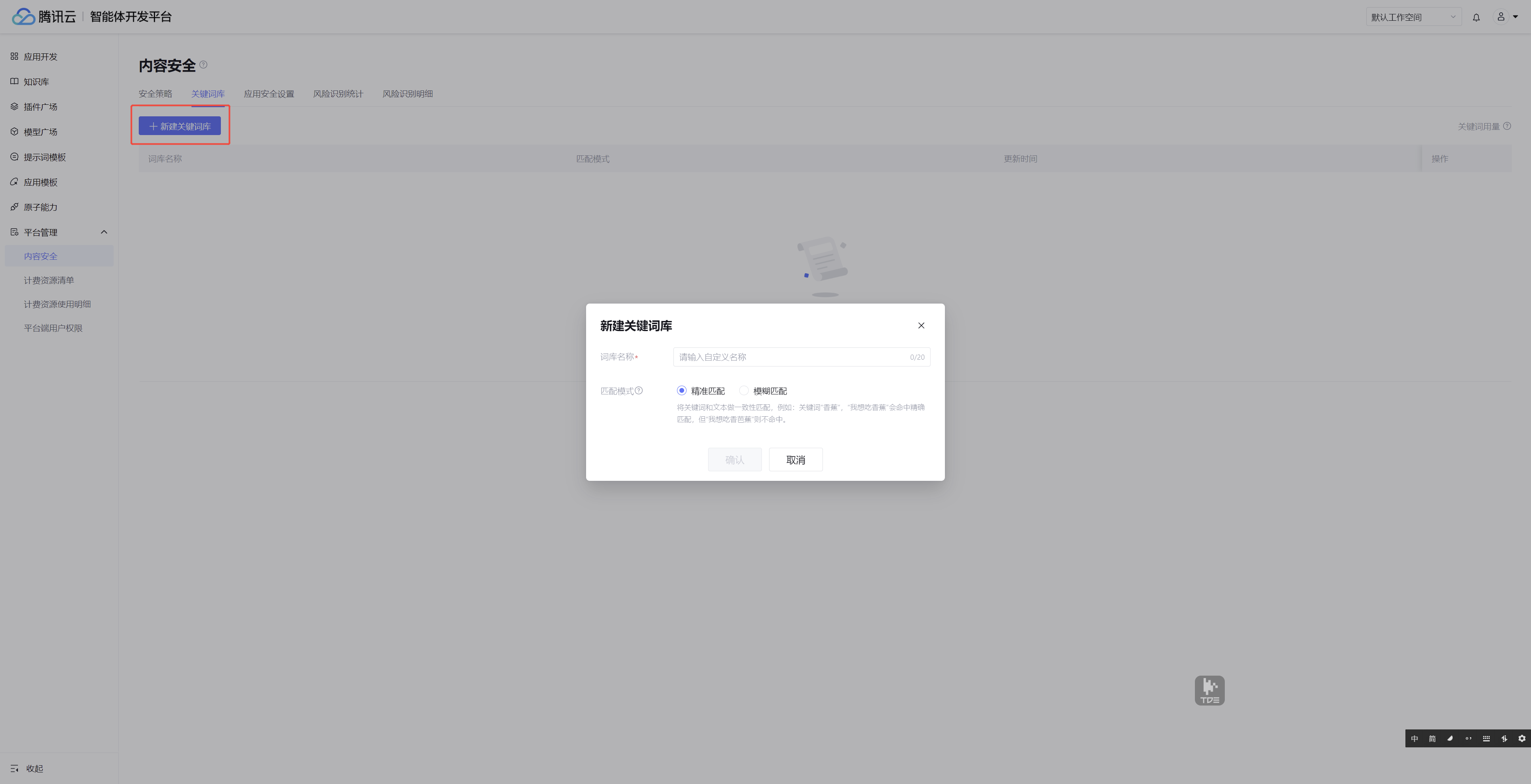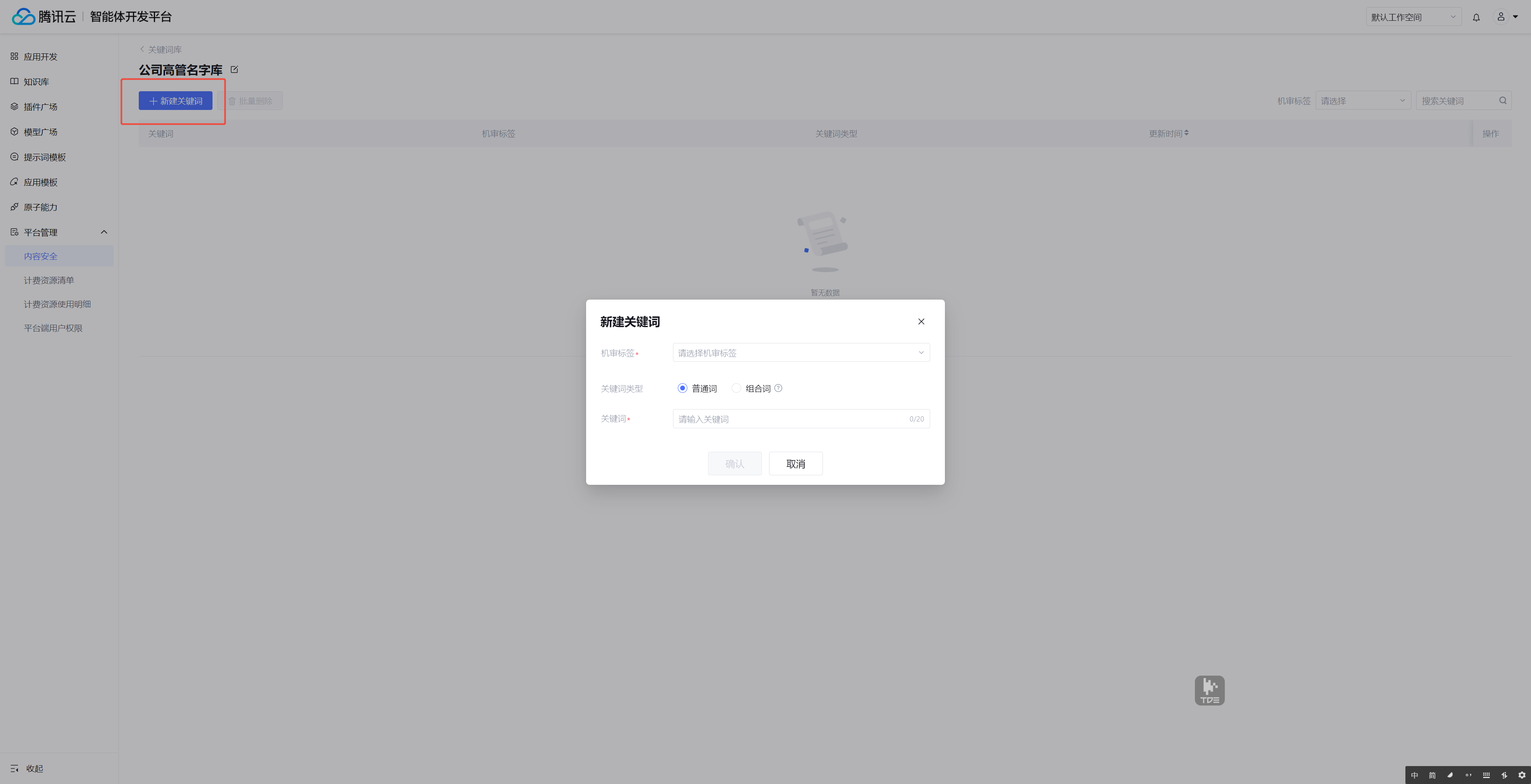 1. 单击平台管理 > 内容安全 > 关键词库,进入自定义关键词的维护管理页面。第一步需要新建关键词库,关键词的添加都是在具体的关键词库中进行。