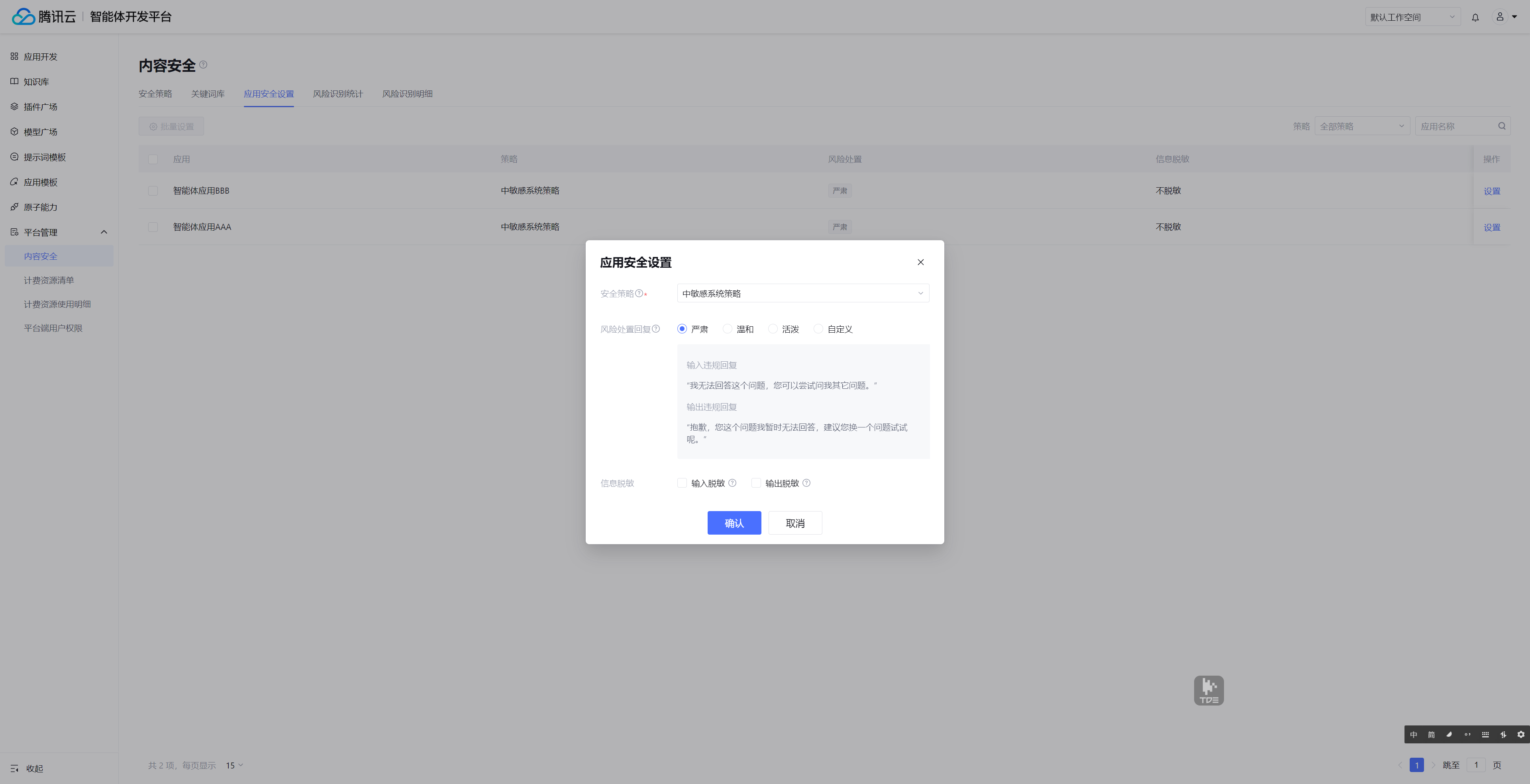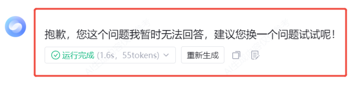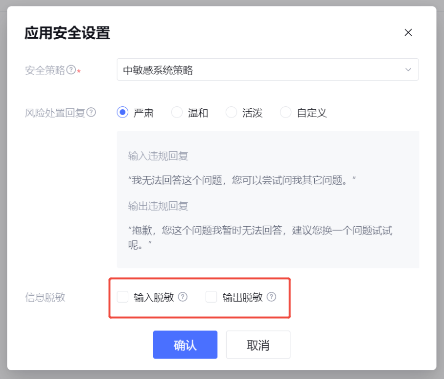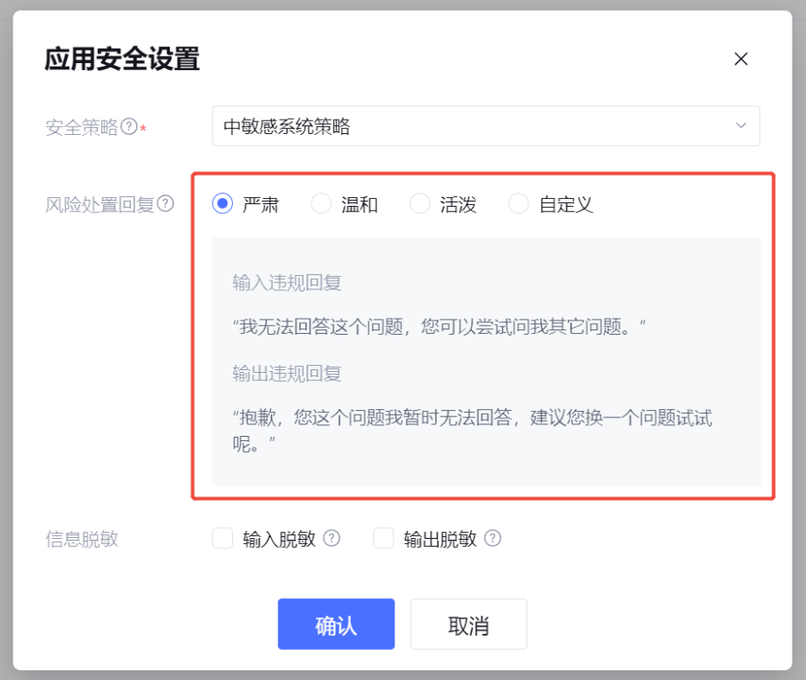 2.2 风险处置回复:当输入/输出被识别为违规时,在 ADP 应用的对话端文案。
