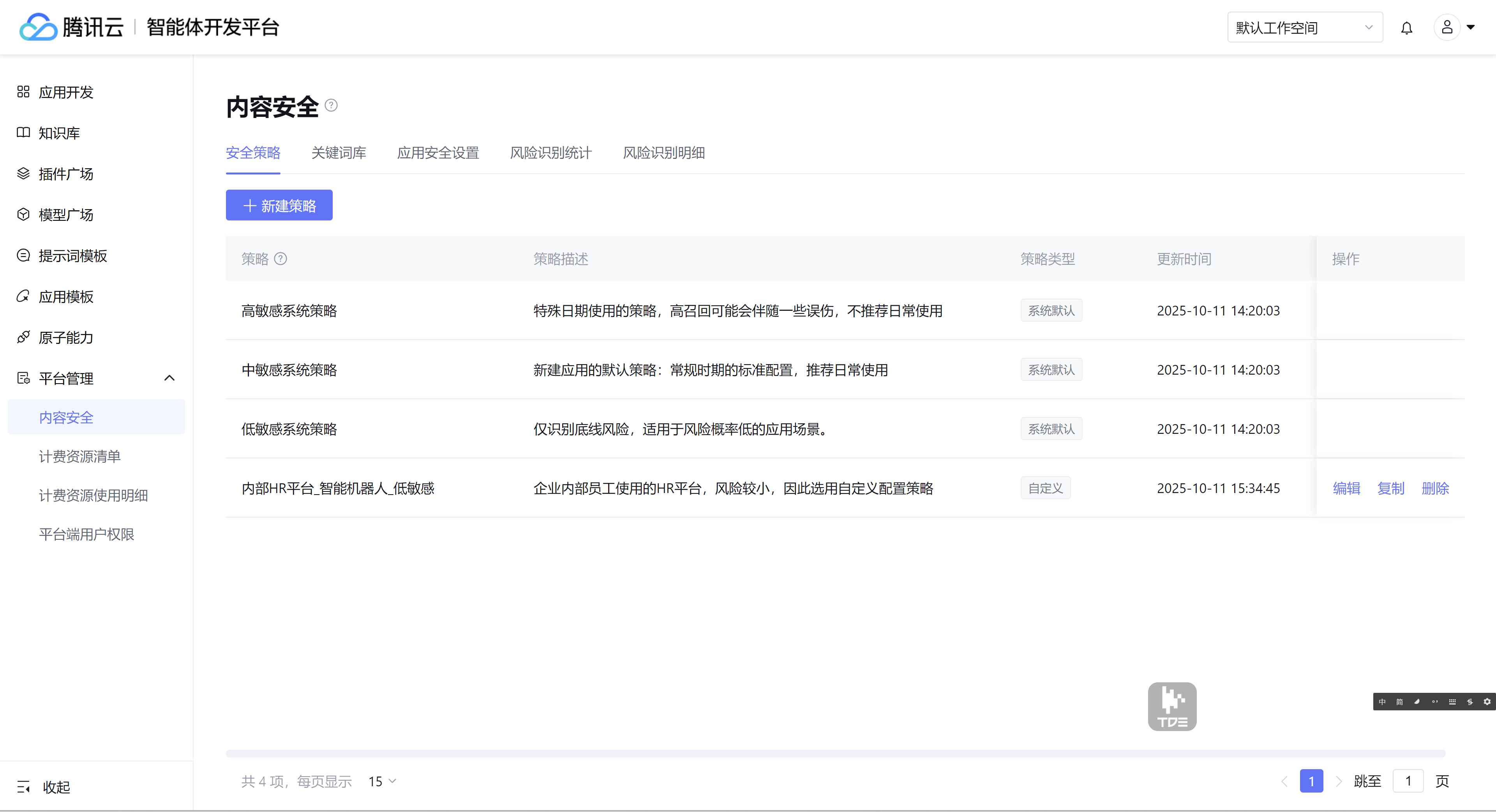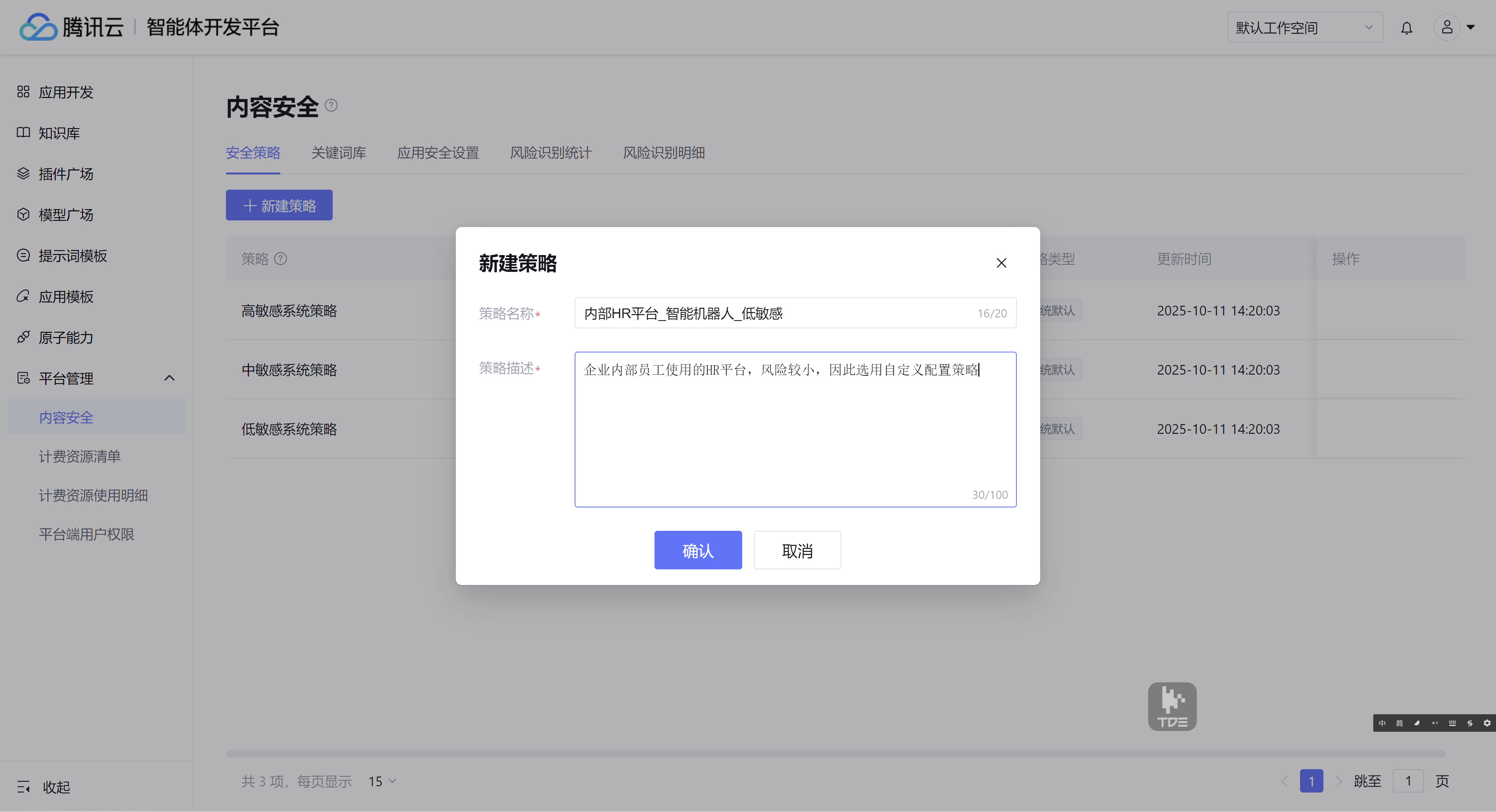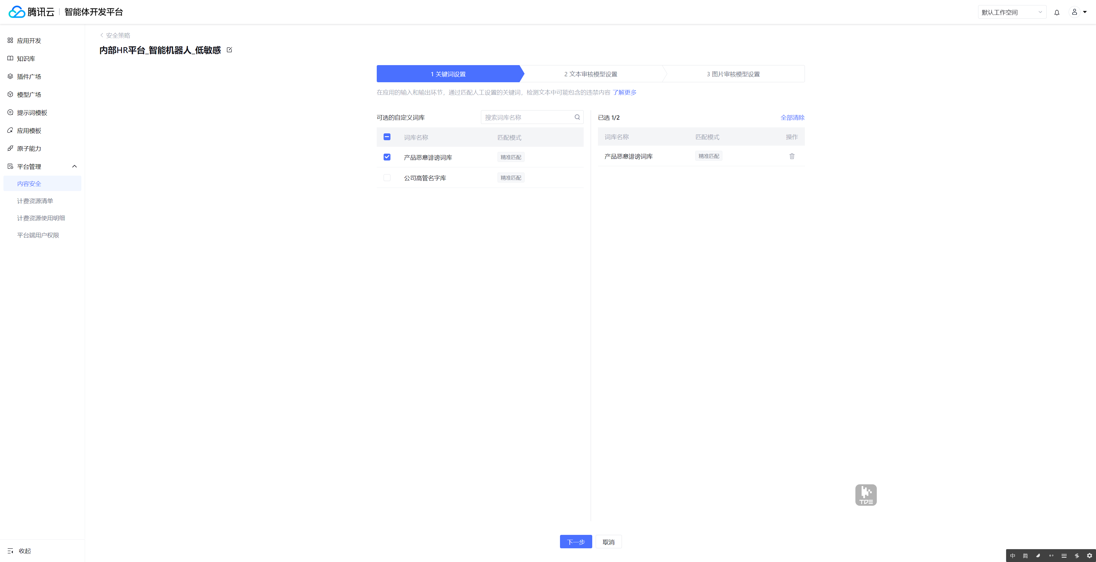 1. 进入 腾讯云智能体开发平台 控制台,单击左侧菜单平台管理 > 内容安全。