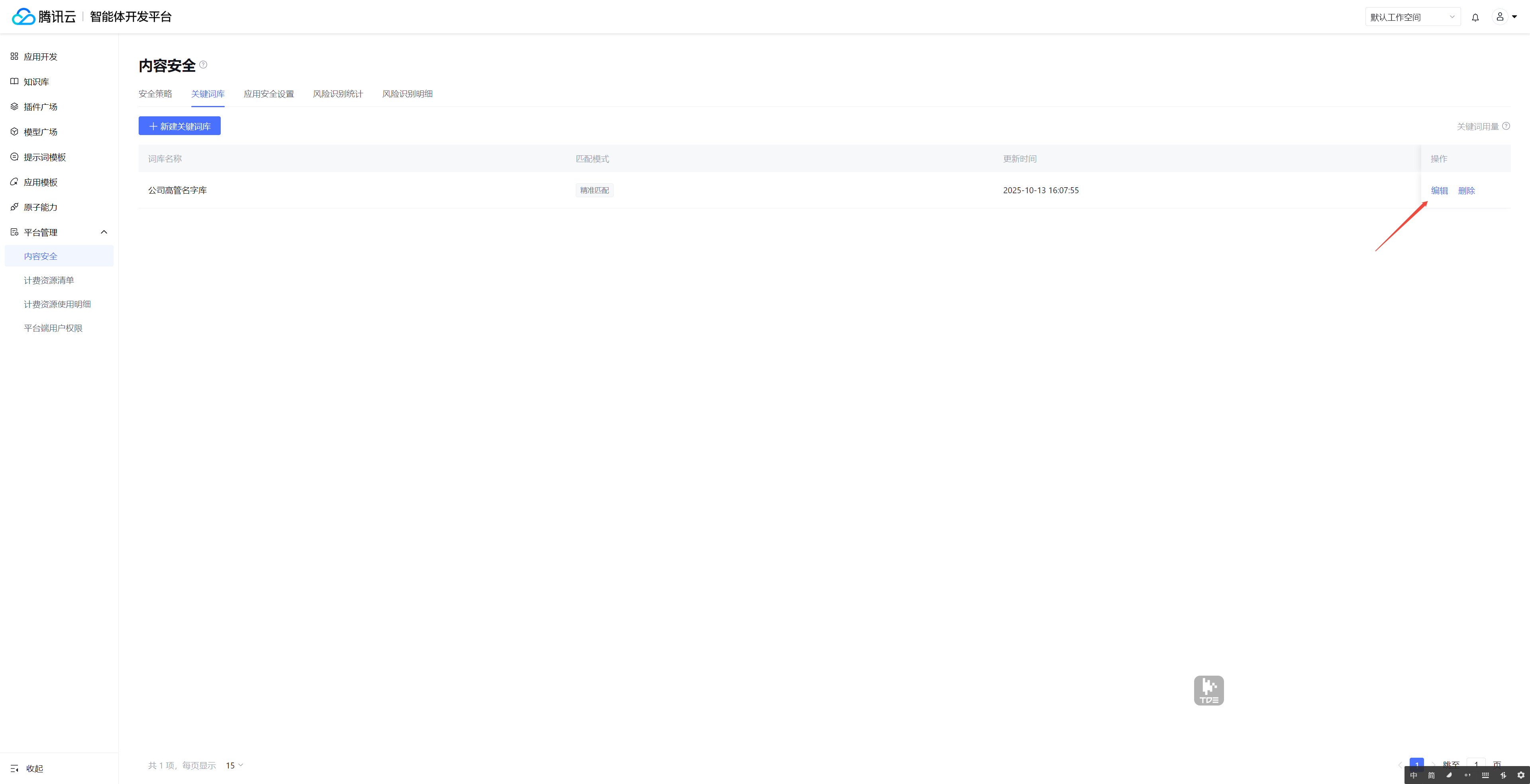 2. 新建词库后,单击编辑,进入对词库的具体关键词操作。