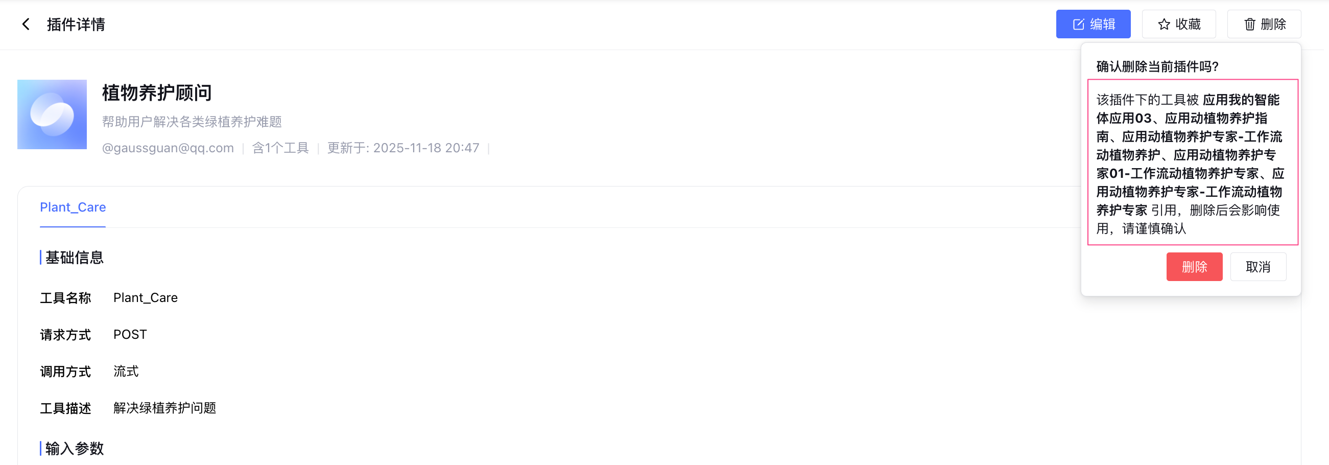 当删除自定义插件时,如果插件已经被引用,会进行删除提示说明。