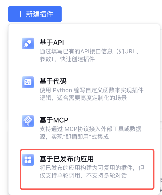 进入插件广场,单击创建插件,选择基于已发布的应用。