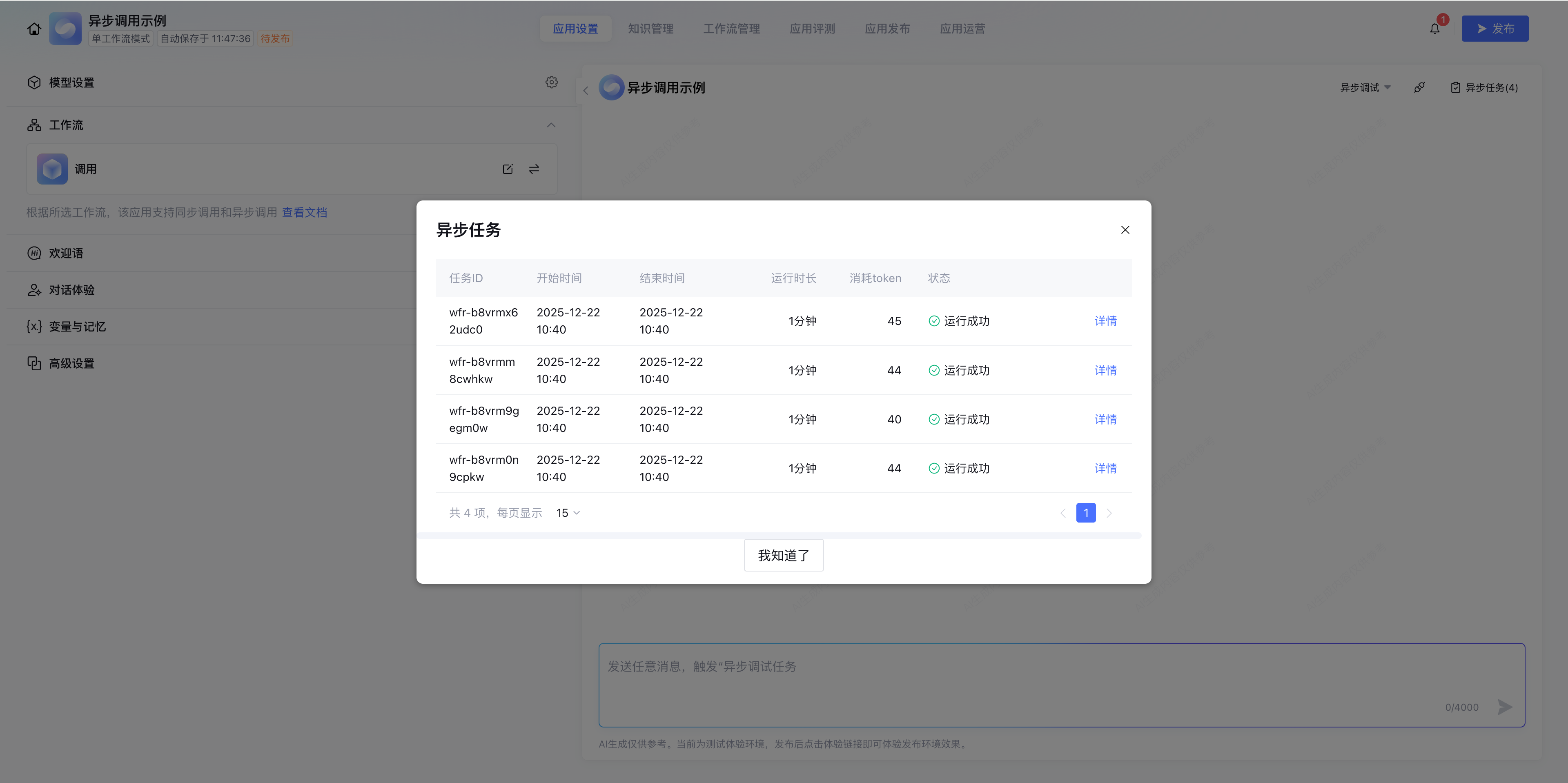 单击异步任务,进入任务管理系统,查看对话调试窗口中的异步任务执行情况。