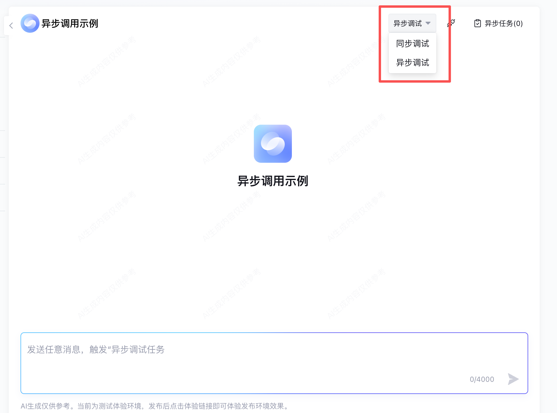 在对话调试窗口中,单击同步调试可打开选项弹窗,用于选择工作流的调试方式。弹窗内提供"同步调试"和"异步调试"两个选项。选择"异步调试"后,可直接在调试窗口中进行对话,测试异步调用的效果。