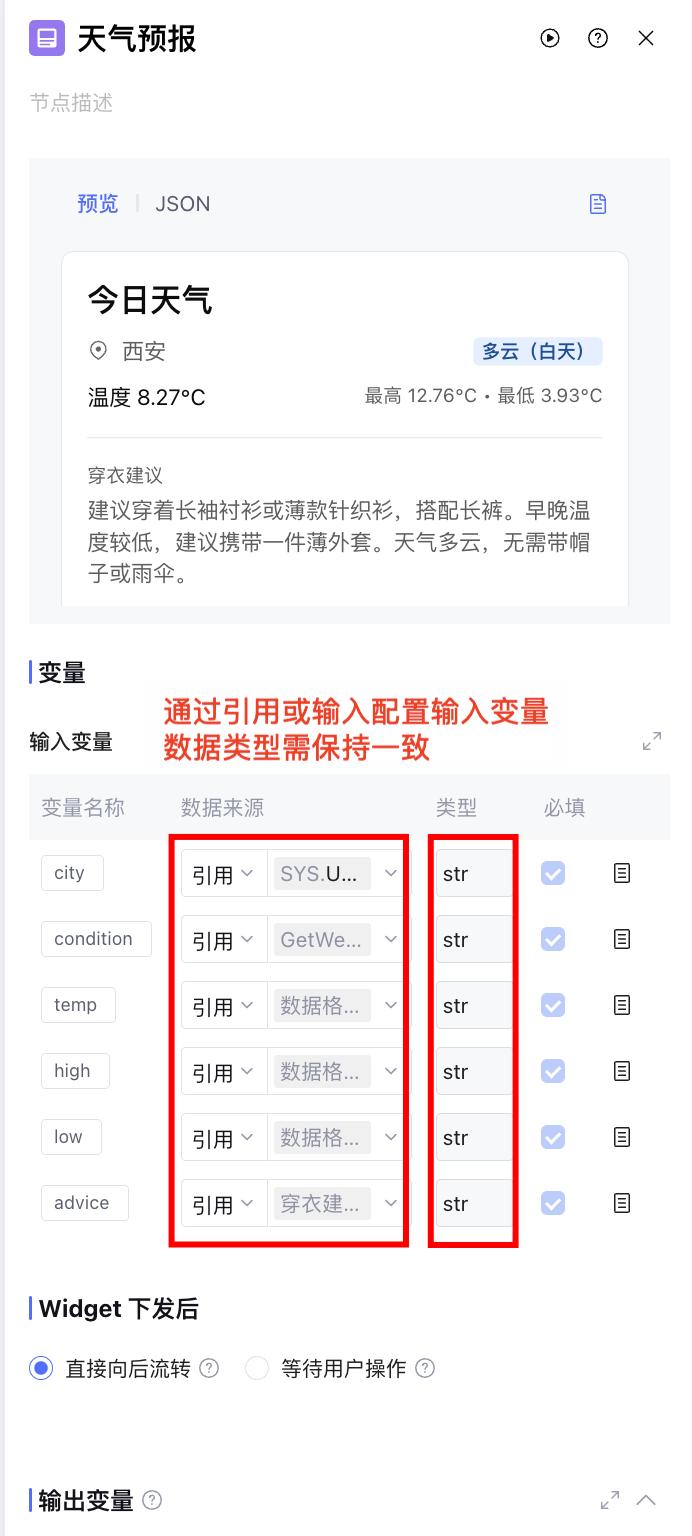 对天气预报 Widget 节点进行配置时,需要根据变量名称和类型正确引用数据来源。其中由于 GetWeatherInfo 工具的部分输出变量类型为 float,与 Widget 所需的输入变量格式不一致,因此需通过代码节点进行数据格式转换,再进行引用。如下图所示: