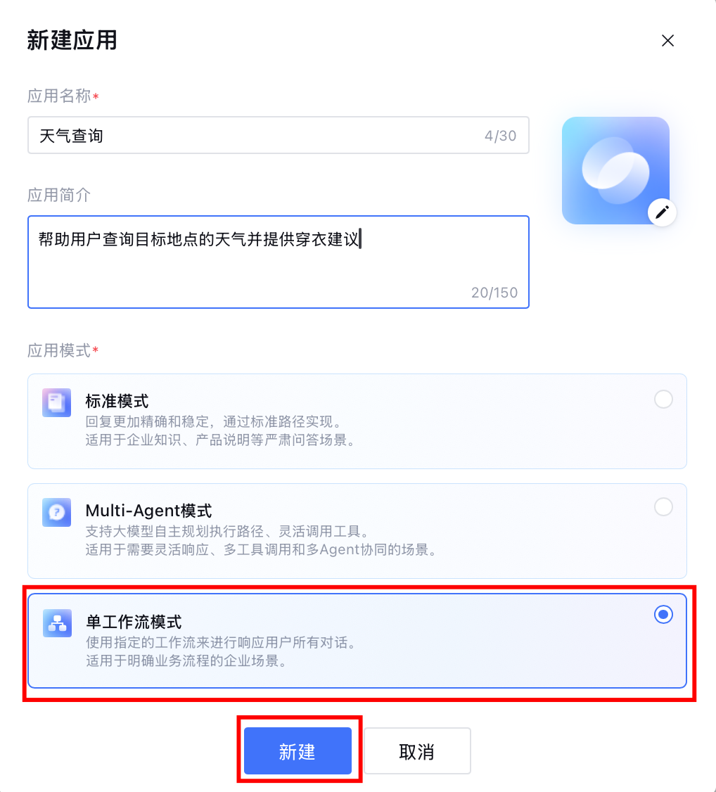 1. 在应用开发界面,单击新建应用,输入应用名称、应用简介,选择单工作流模式,单击新建。