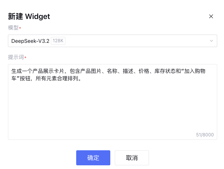 自然语言生成是指大模型根据用户的自然语言描述,自动生成 Widget 的基础结构与展示样式,用户无需手动编写模板代码,即可快速创建符合需求的 Widget,适合用于快速验证想法或构建初始版本。