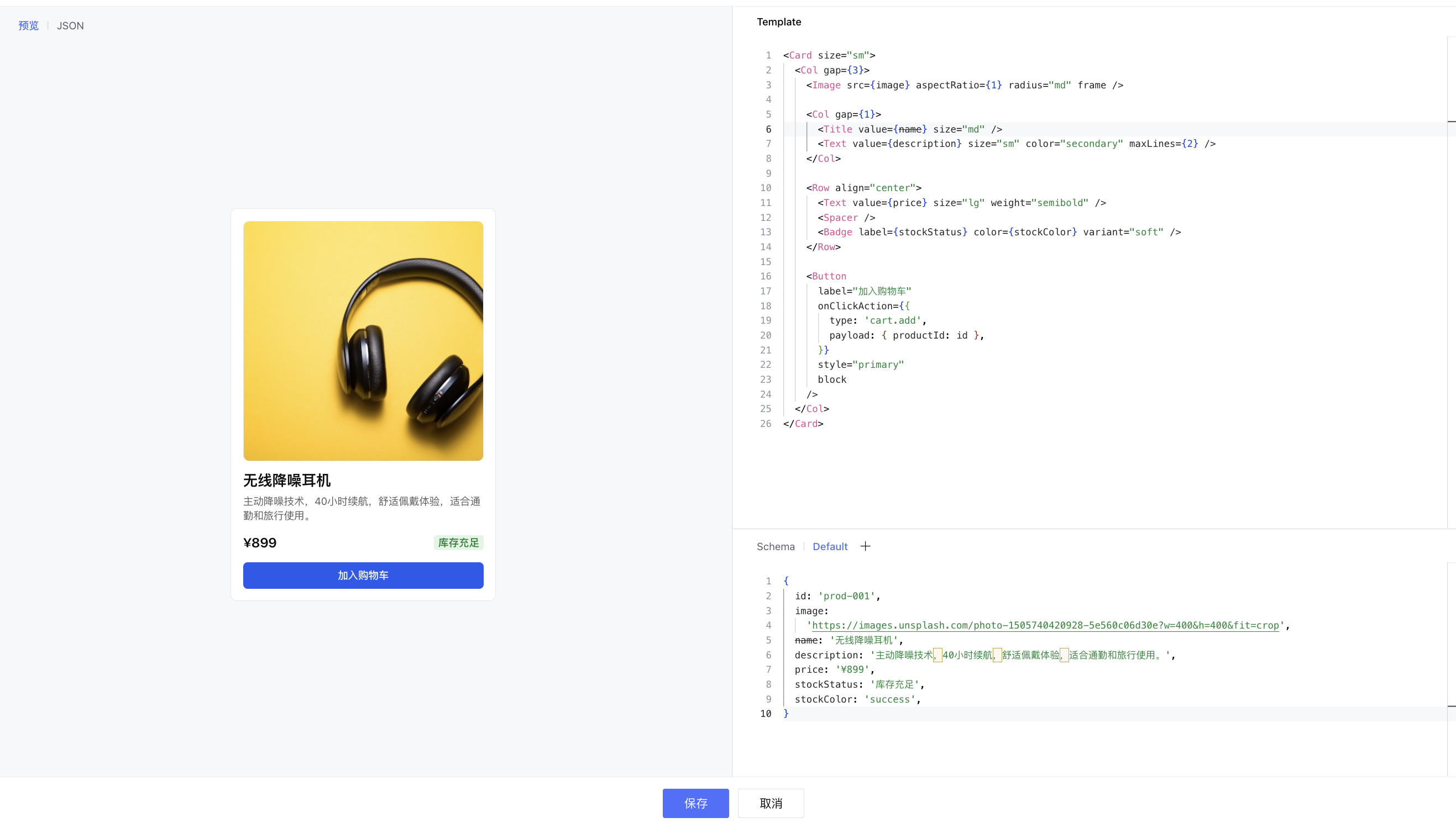 提示词输入框输入内容:生成一个产品展示卡片,包含产品图片、名称、描述、价格、库存状态和"加入购物车"按钮,所有元素合理排列。