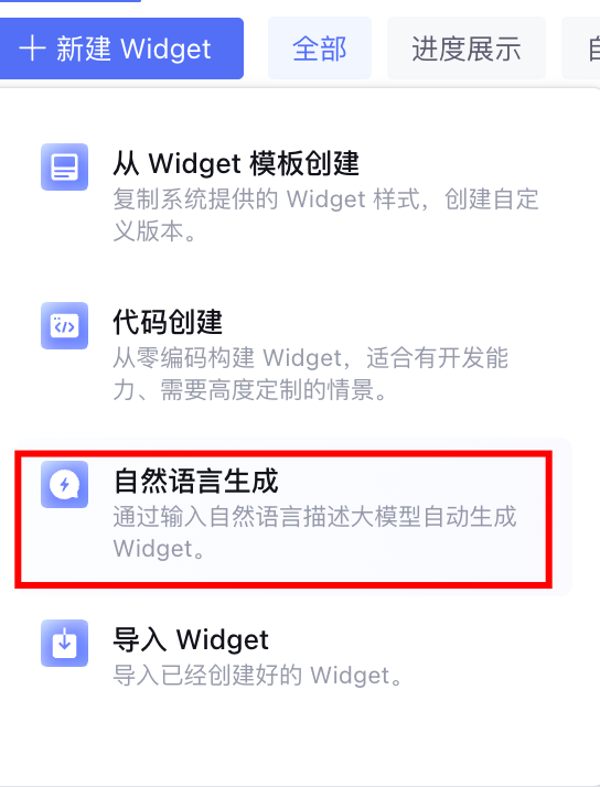 在 Widget 开发页面单击新建 Widget,选择自然语言生成。