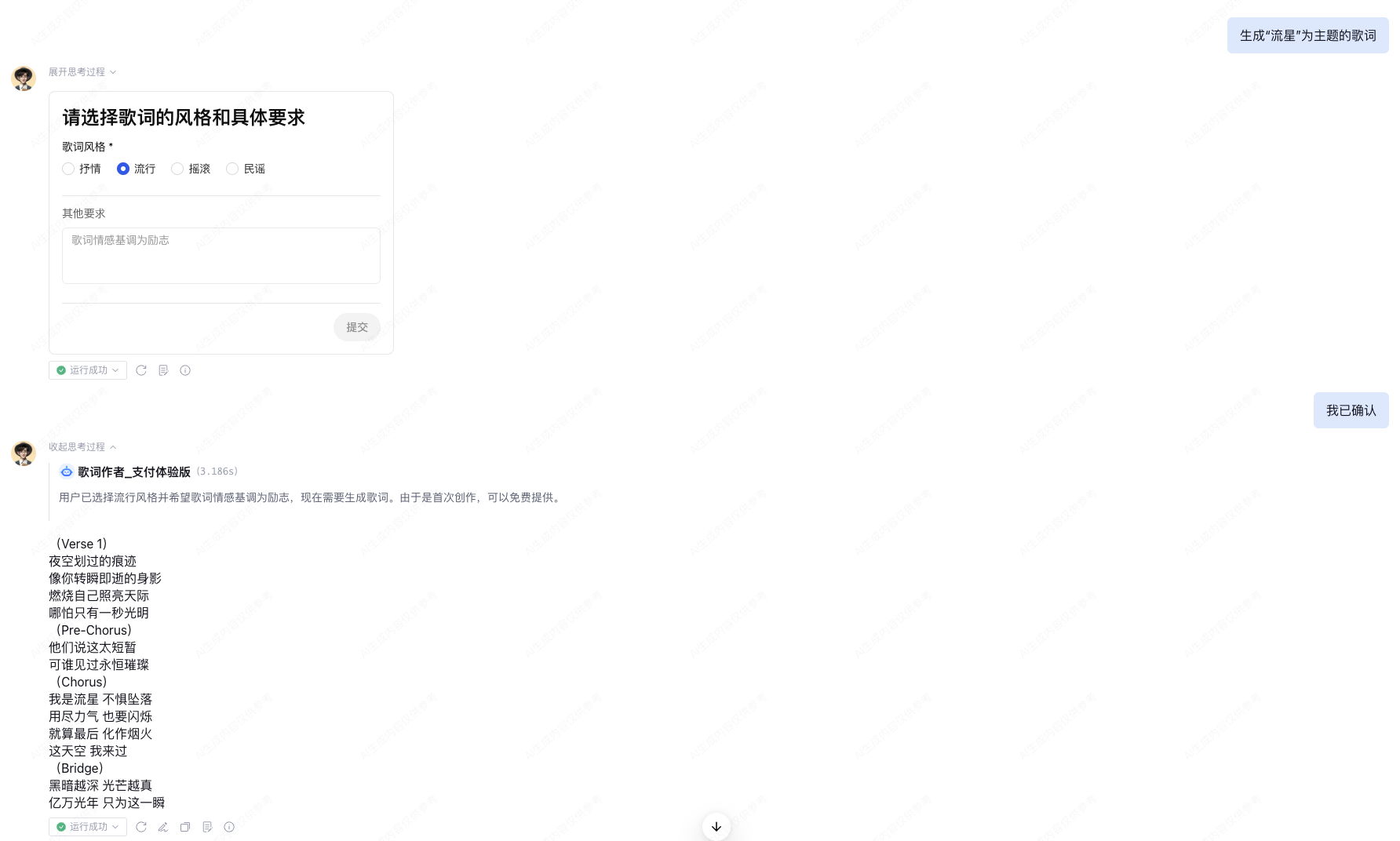 通过为应用歌词作者_支付体验版配置澄清询问 Widget,展示配置流程和应用效果。