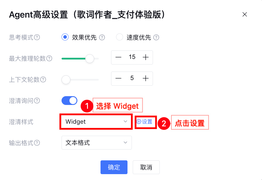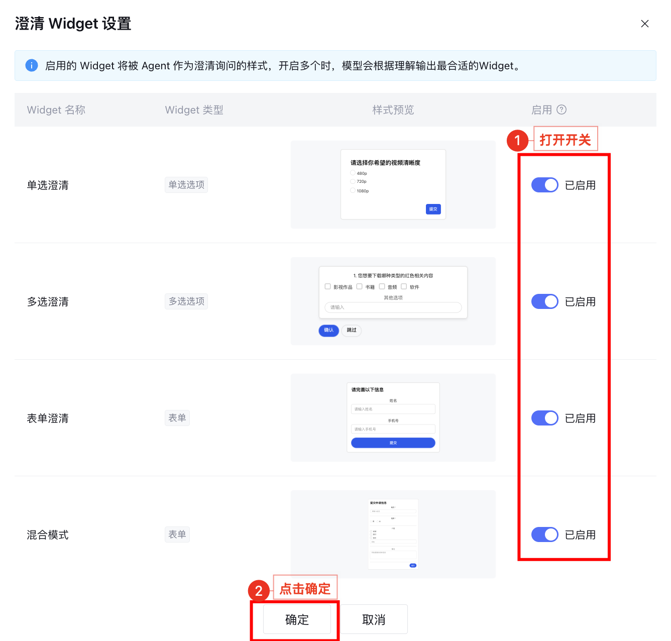 3. 打开开关启用澄清 Widget,允许开启多个,模型会根据理解输出最合适的 Widget,单击确定,完成设置。