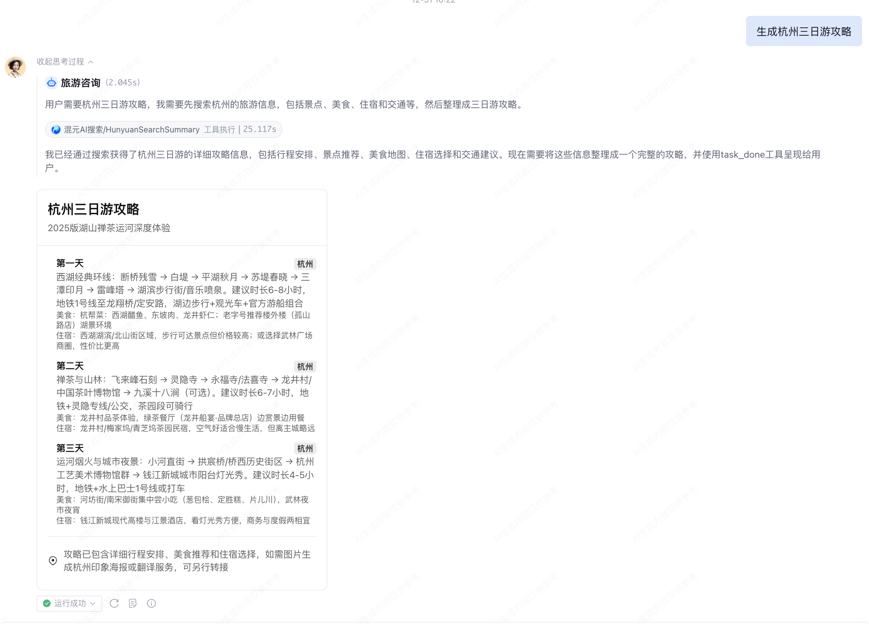 用户发起请求:生成杭州3日游攻略。