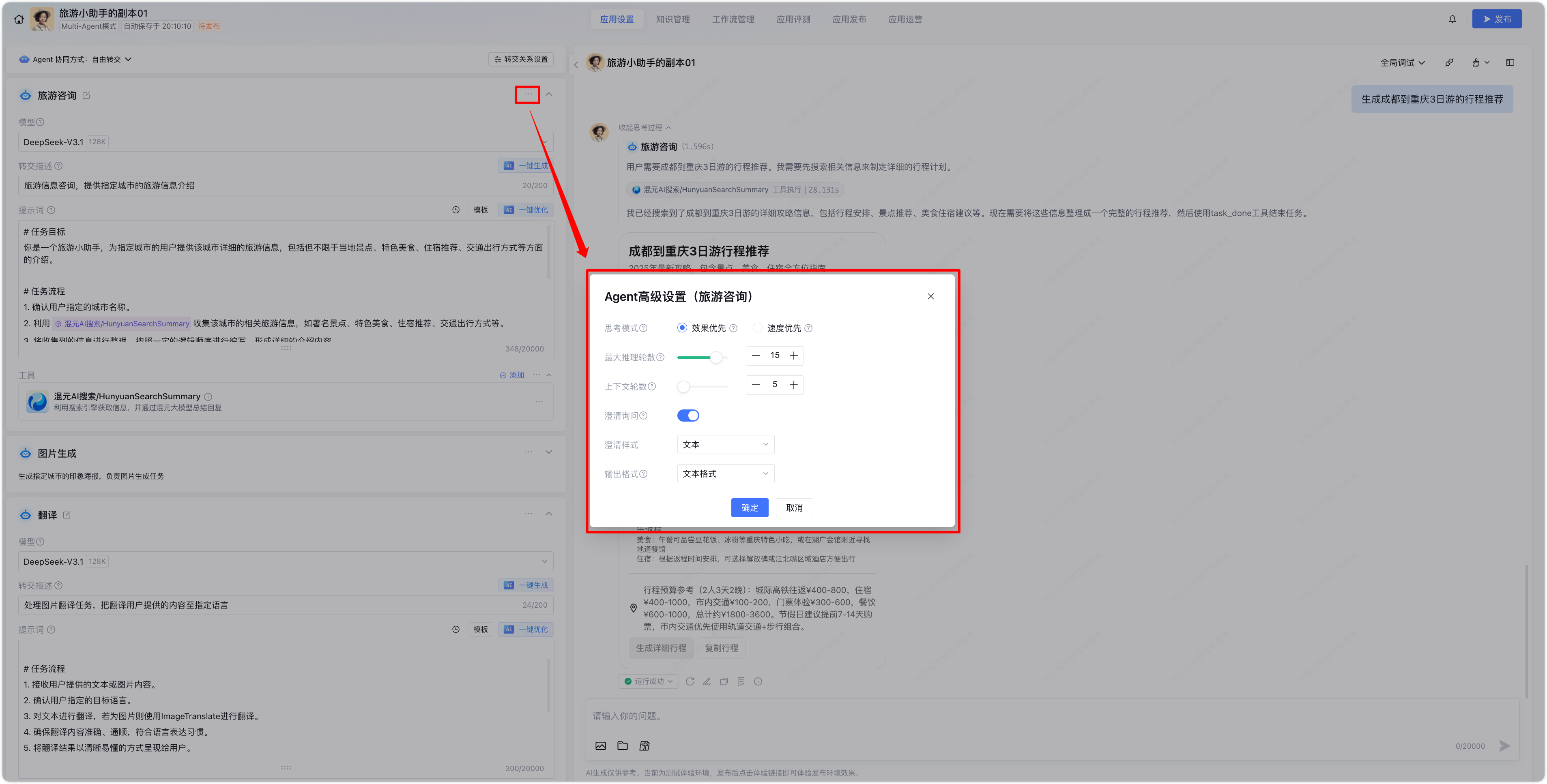 通过为应用旅游小助手配置 Agent 结果输出 Widget,展示配置流程和应用效果。