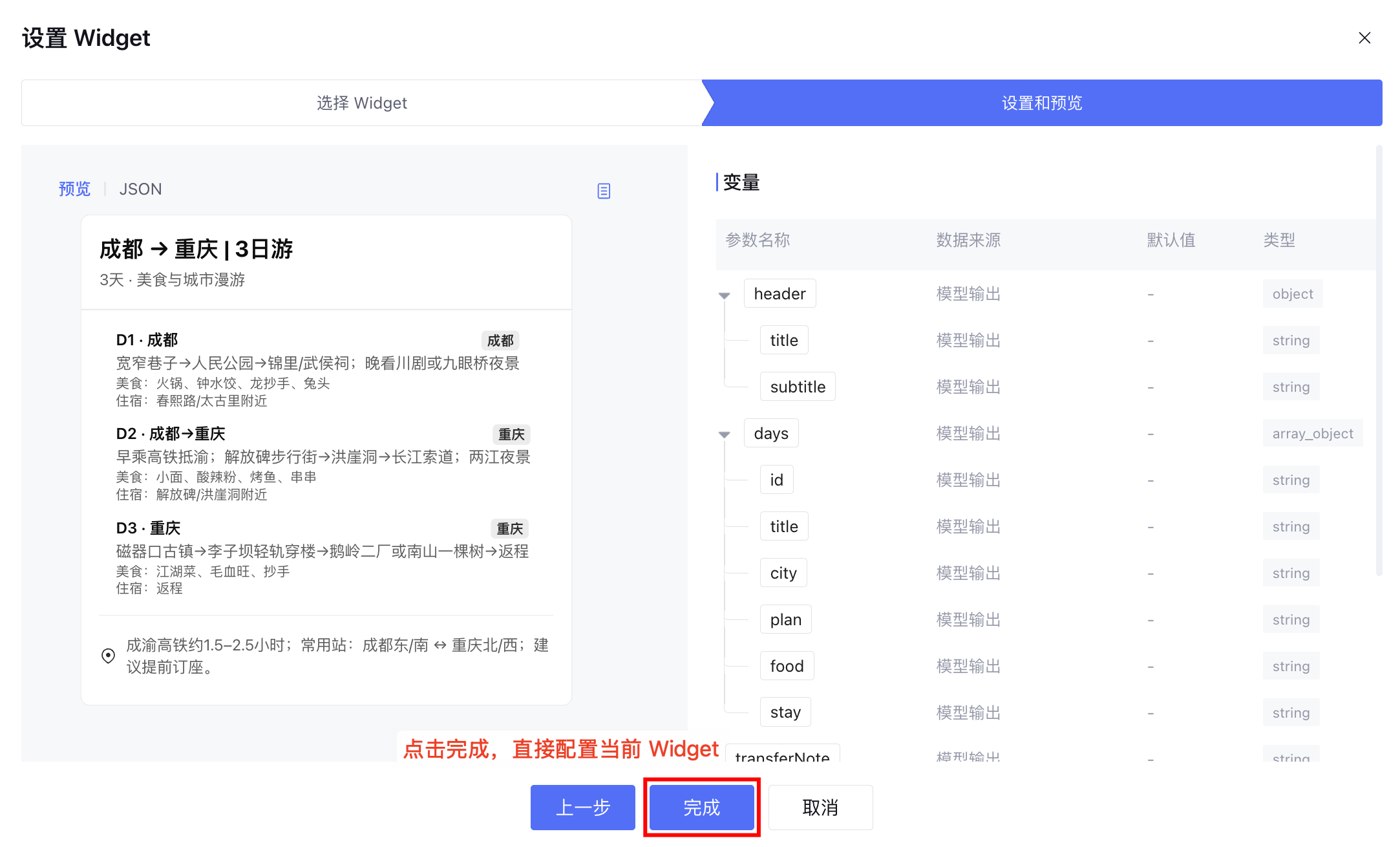 单击完成直接使用当前 Widget。
