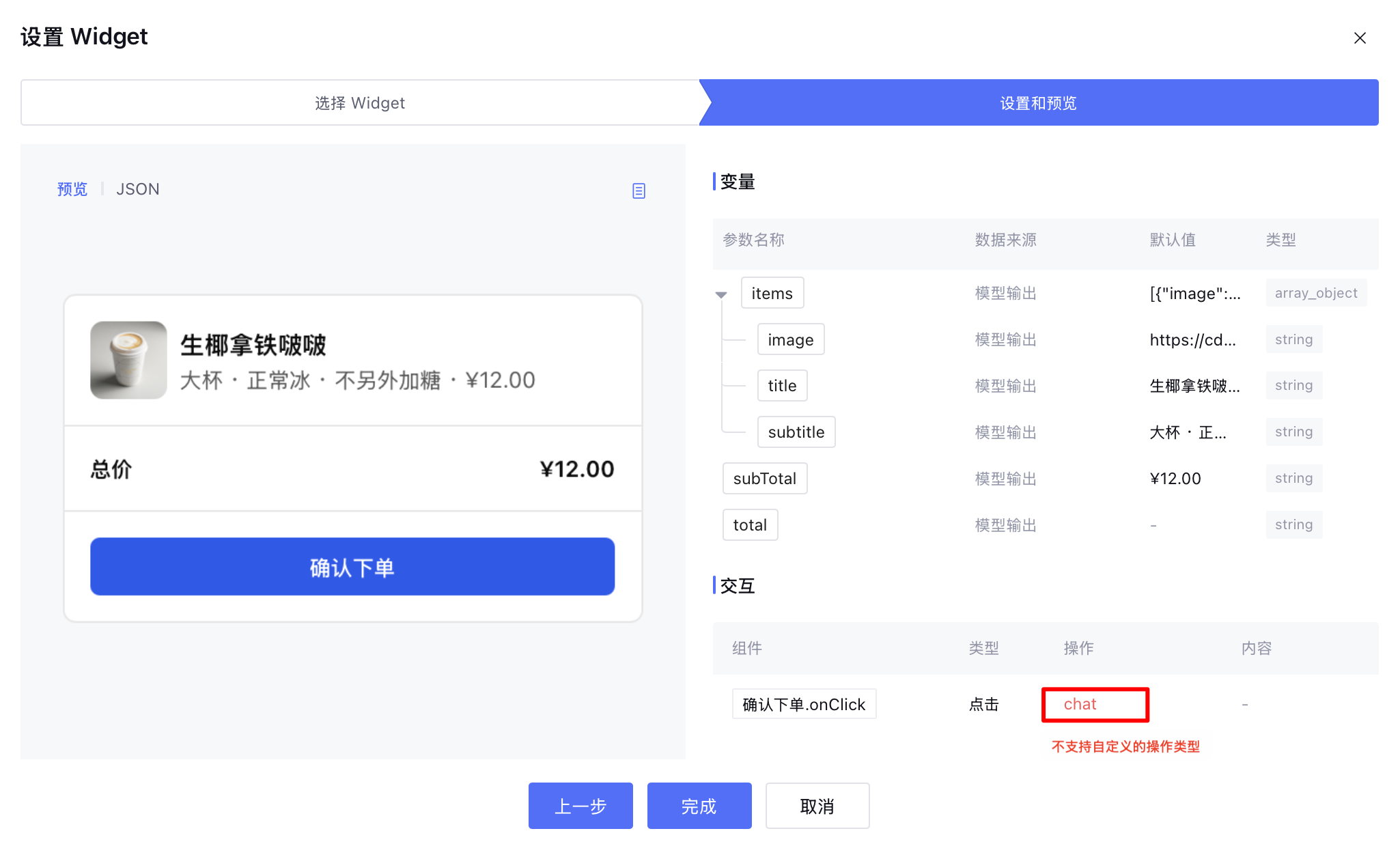 当引用 Widget 时,如果该 Widget 配置了 Action,在 Multi-Agent 模式中,相关配置会自动回显到 Widget 设置和预览页;在工作流画布中,相关配置会自动回显到 Widget 节点详情页。对于平台暂不支持配置的交互操作,操作栏内容将以红色高亮提示。
