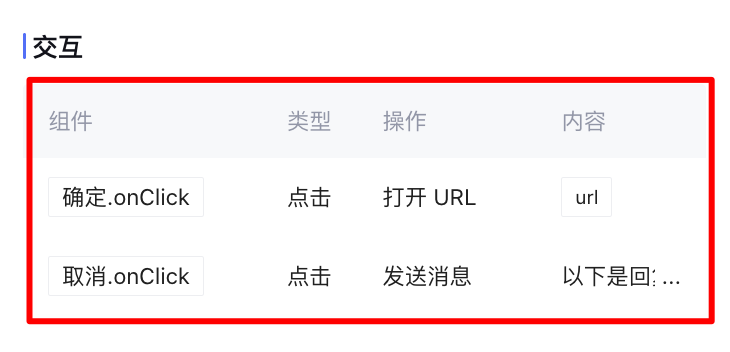 Widget 是否支持交互取决于是否包含支持 Action 配置的组件,您可以通过组件属性的配置声明对应的 Action 的类型及参数。Action 通常包含以下两个核心字段: