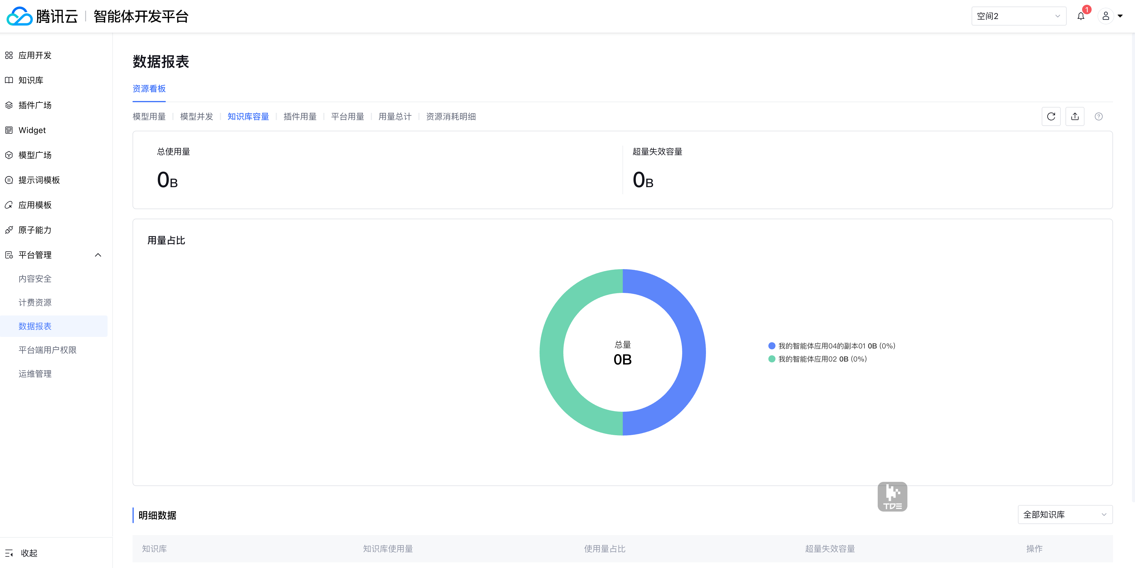 可在数据报表-资源看板-知识库容量中查看知识库使用情况: