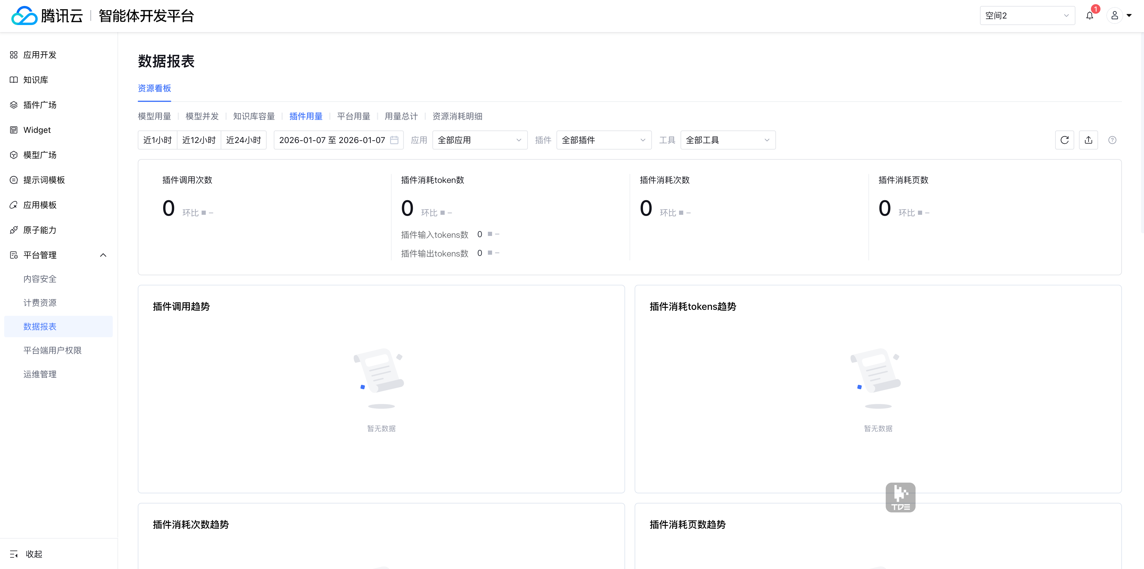 除调用知识库问答插件、知识检索插件、数据库 text2sql 插件、重排序插件会产生模型用量以外,其他插件在被调用时均按插件上报用量,调用场景包括添加为 Agent 工具调用,在工作流中调用。可在数据报表-资源看板-插件用量中查看: