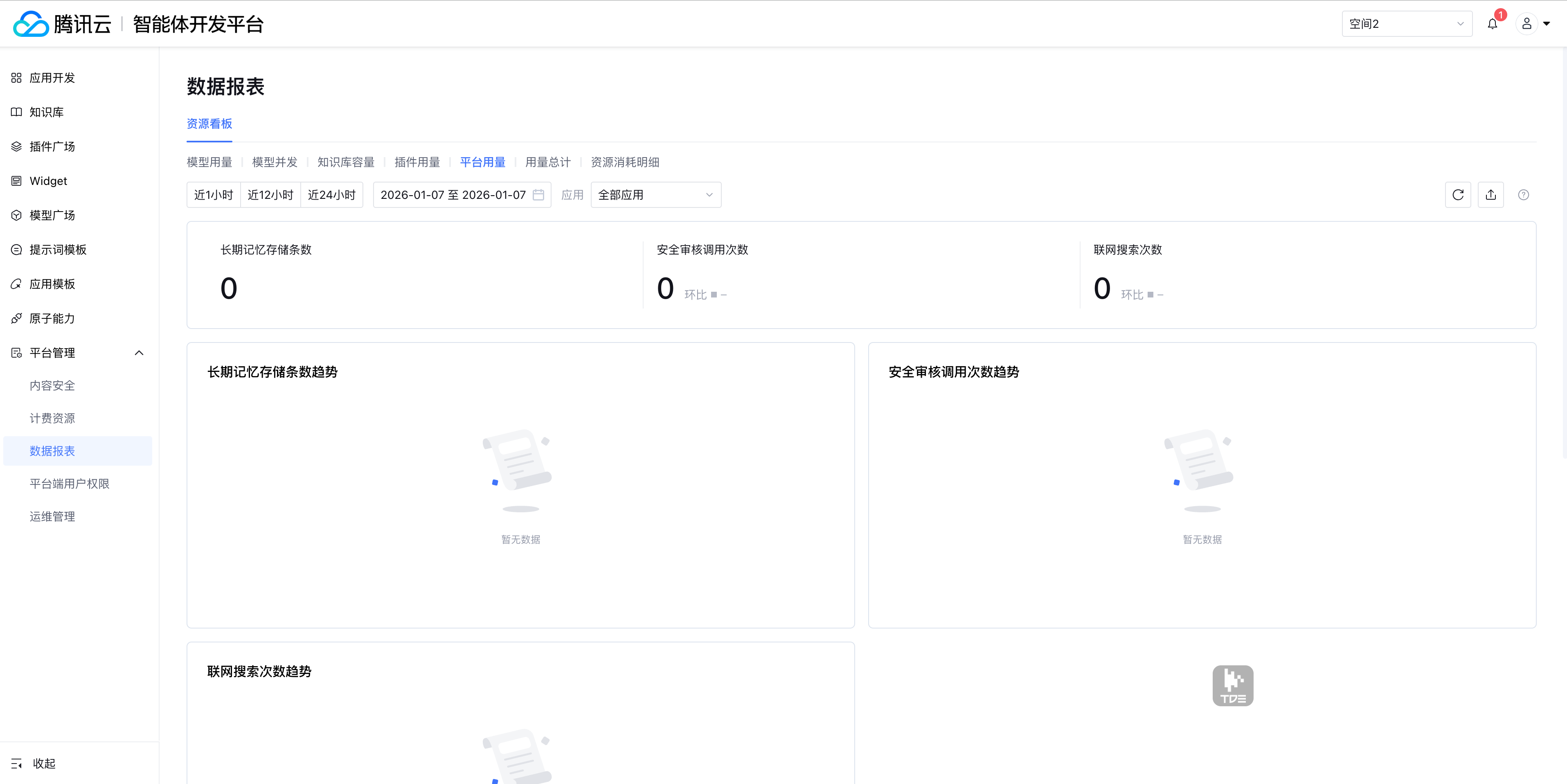 可在数据报表 > 资源看板 > 平台用量 中查看: