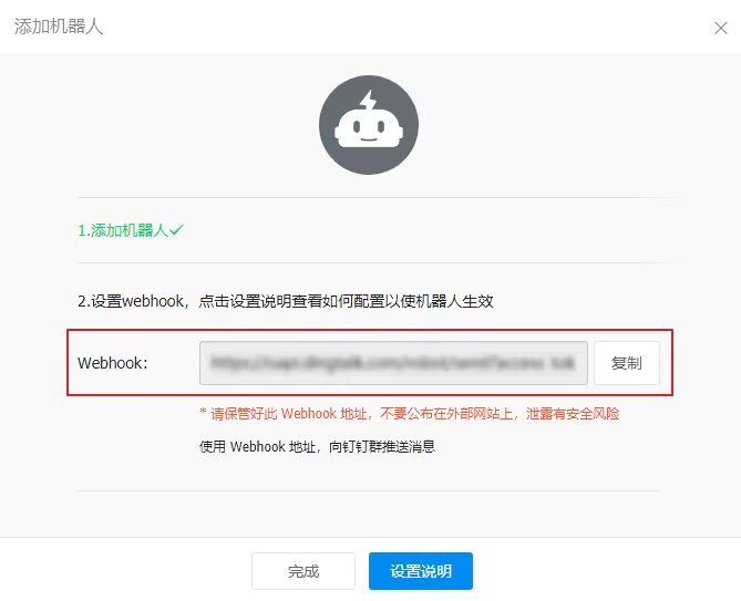 创建完成后,界面会展示 webhook 地址。
